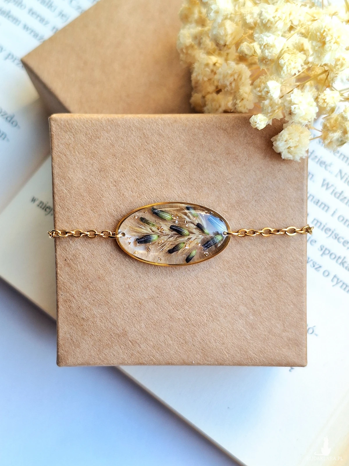 Urocza bransoletka z zatopionymi kwiatami lawendy, trawą i płatkami złota. Wykonana z wysokiej klasy żywicy, która nie zmienia koloru pod wpływem promieniowania uv oraz wysokiej jakości stali chirurgicznej.