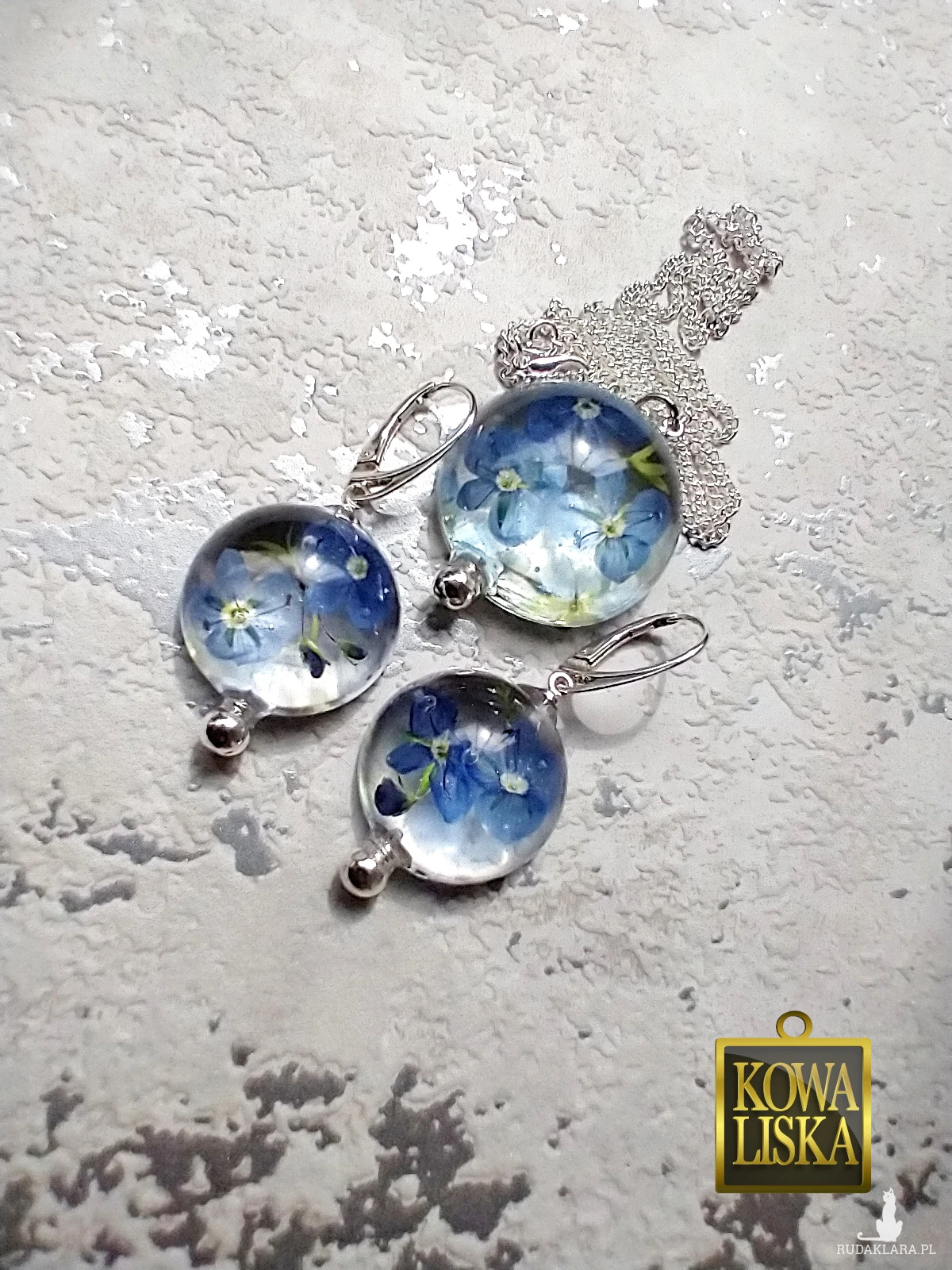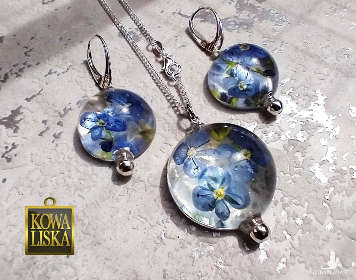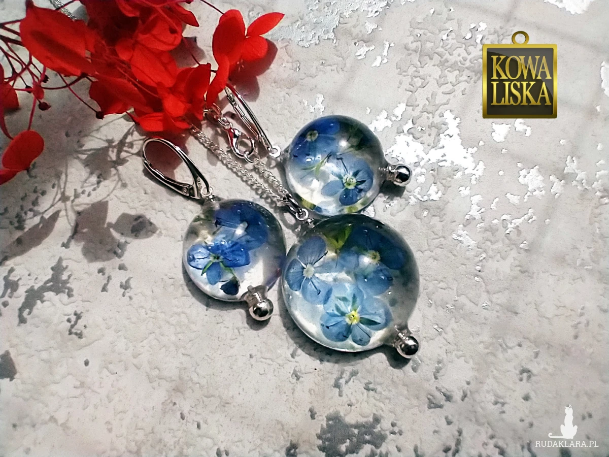 Delikatne, ulotne kwiatuszki przetacznika zamknięte w bąbelkach z krystalicznej żywicy. Wypełniając szkliste wnętrze, cudownie świecą eterycznym kolorem i rzucają przepiękne refleksy.