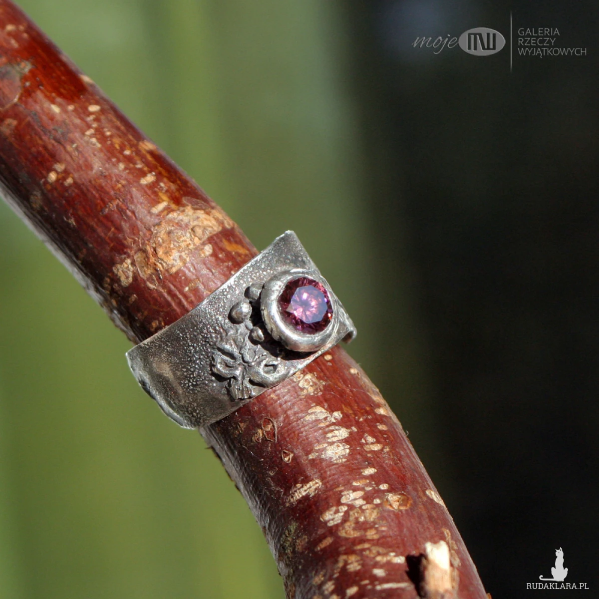Pierścionek/obrączka z fasetowaną cyrkonią we wrzosowym kolorze. Srebro jest oksydowane i przecierane dla wydobycia delikatnej faktury i małych listków na obrączce.