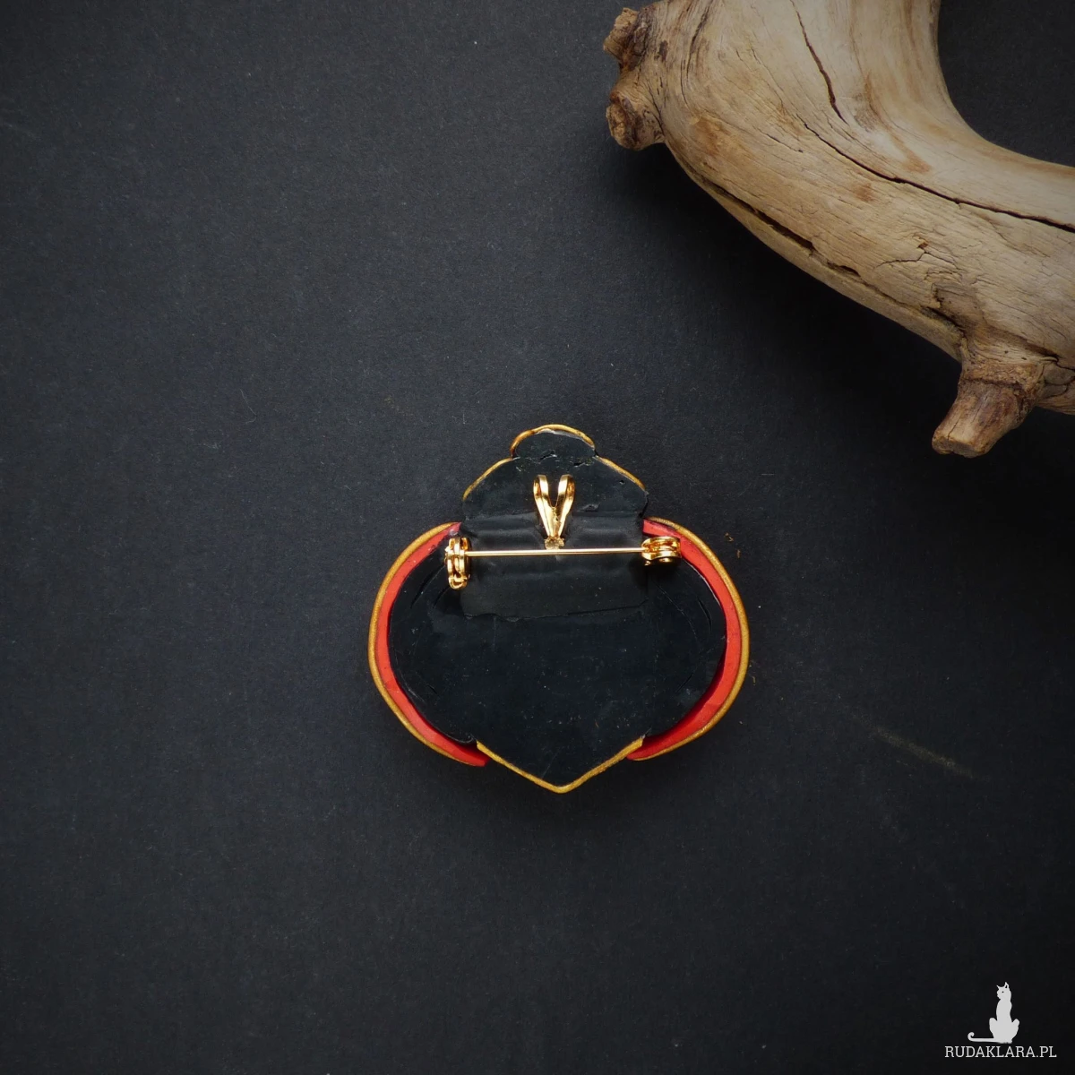 Materiały: glinka polimerowa (modelina Fimo), zapięcie broszkowe z blokadą zabezpieczającą przed przypadkowym otwarciem (stal szlachetna w kolorze złotym), farby akrylowe, czarny spinel fasetowany, szklane koraliki.