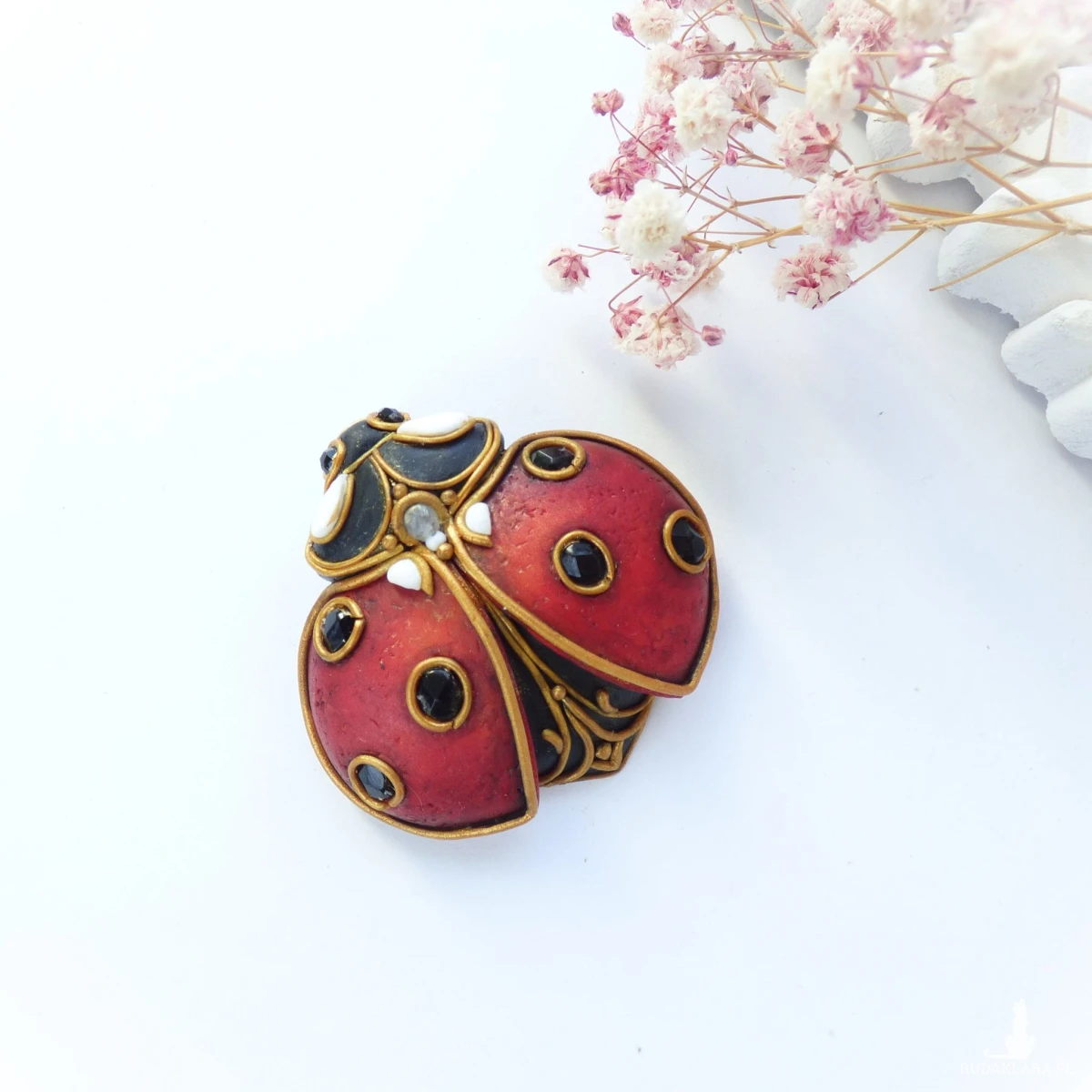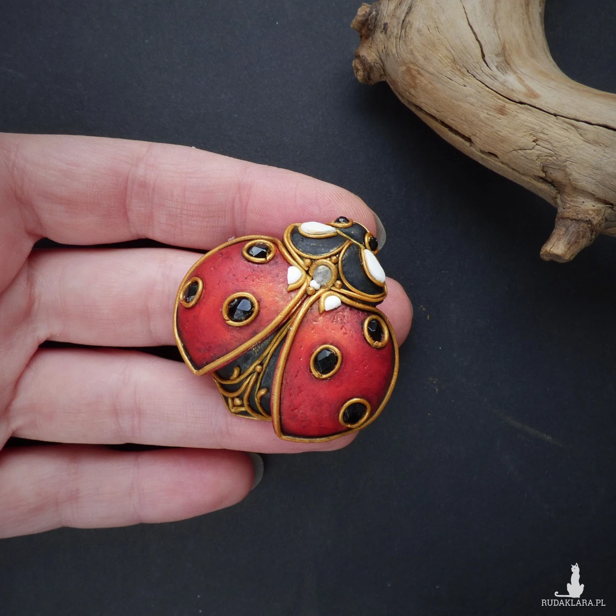 Broszko-wisiorek inspirowany biedronką – połączenie klasyki z naturą. Biedronka od wieków uchodzi za symbol szczęścia, ochrony i spełnionych marzeń. Ten misternie wykonany dodatek został stworzony z dbałością o każdy szczegół: skrzydełka w kolorze ciemnej czerwieni ozdobione są kropkami ze szklanych fasetowanych koralików, a oczka biedronki to czarne spinele – kamienie znane z ochronnych właściwości i głębokiego, magnetycznego połysku.