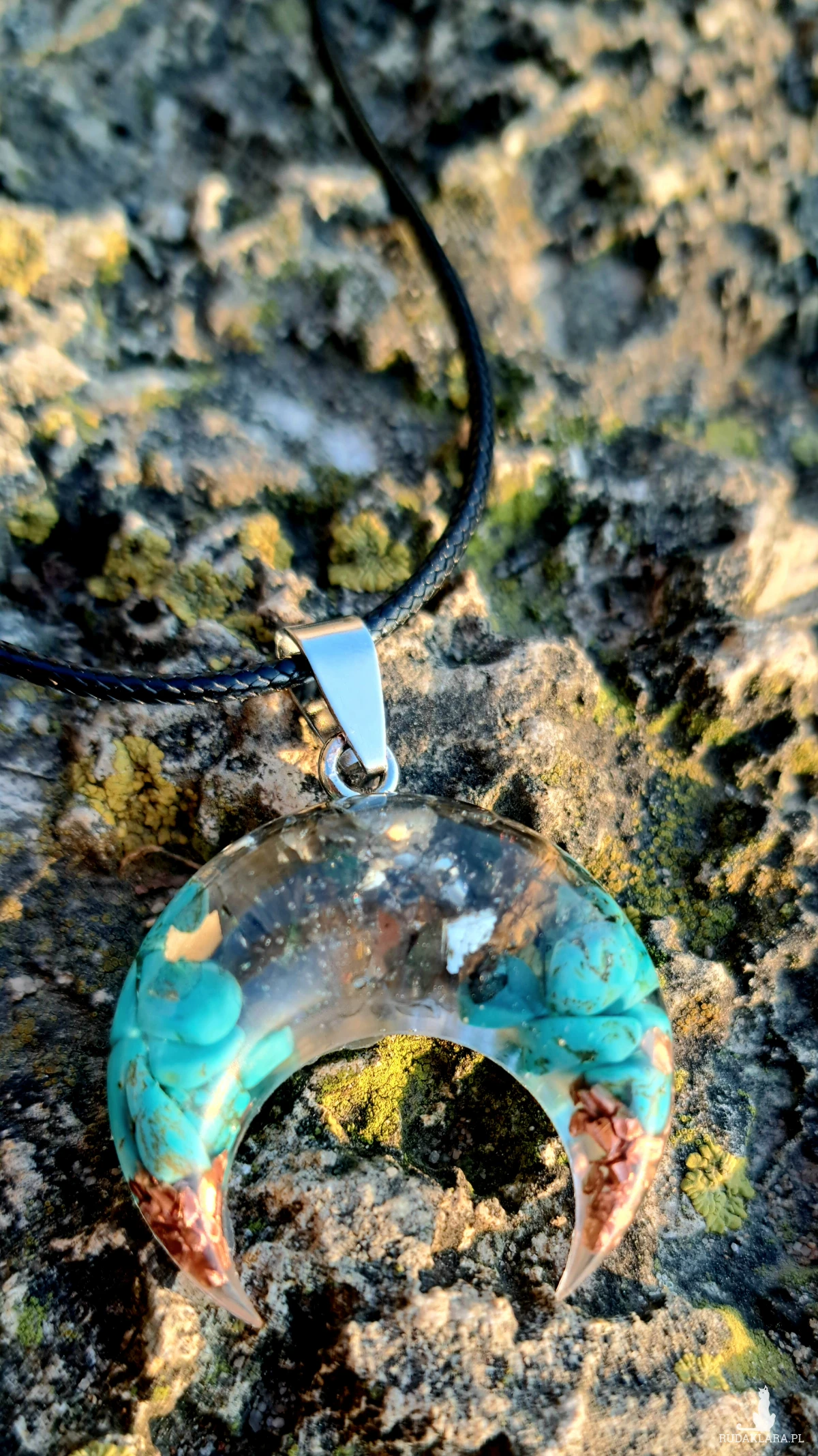 Lunula- orgonit z żywicy, z naturalnymi turkusami .