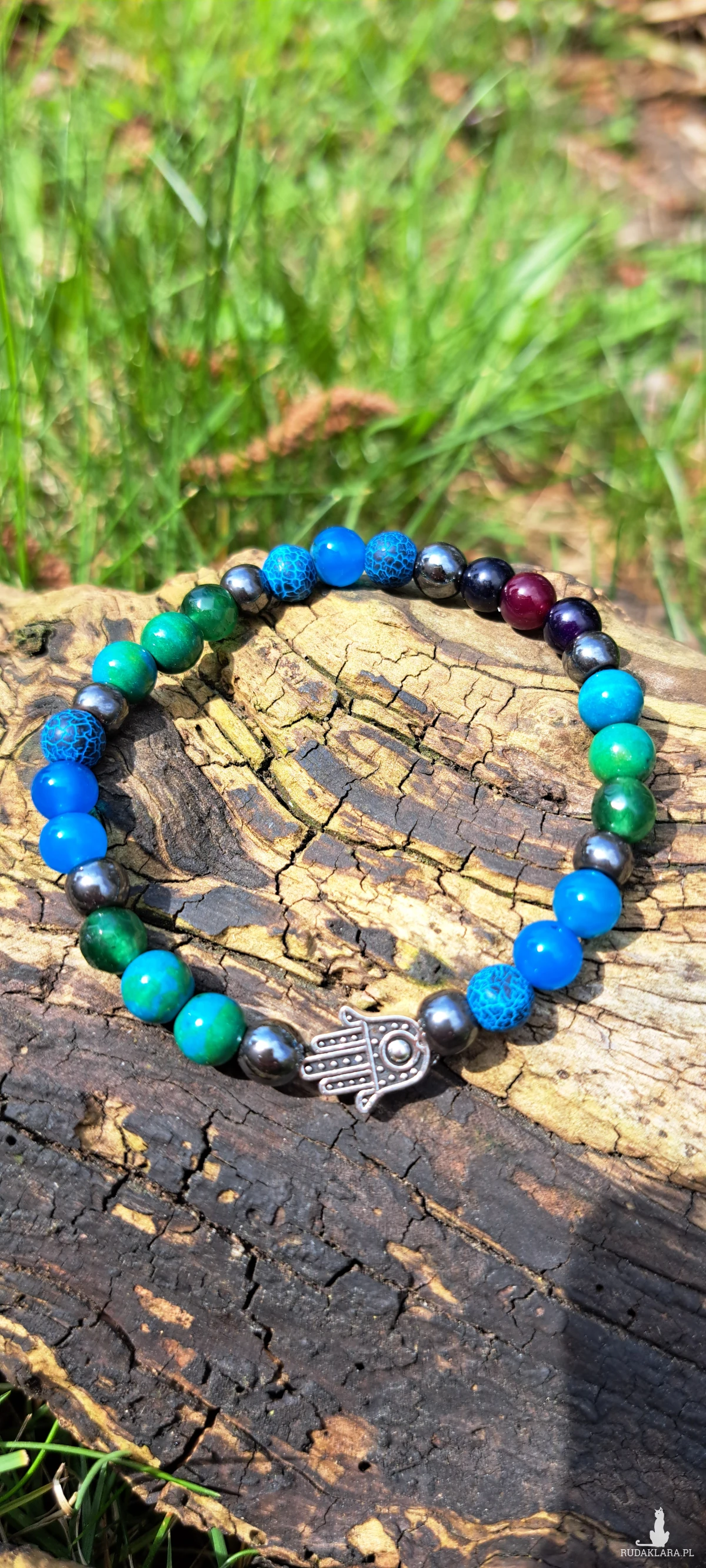 Bransoletka z chryzokolą, agatami i hematytami z symbolem ochronnym- ręką Fatimy.