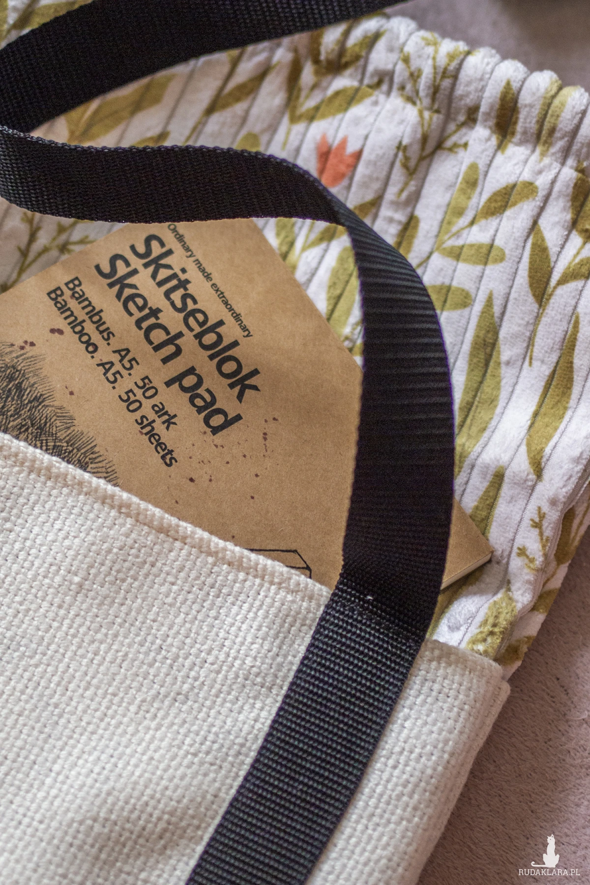 Torba na ramię z kominem, ściągana jak worek, w kolorze ecru. Wykonana z grubego sztruksu w kwiaty. Kieszenie z jasnej plecionej tkaniny.