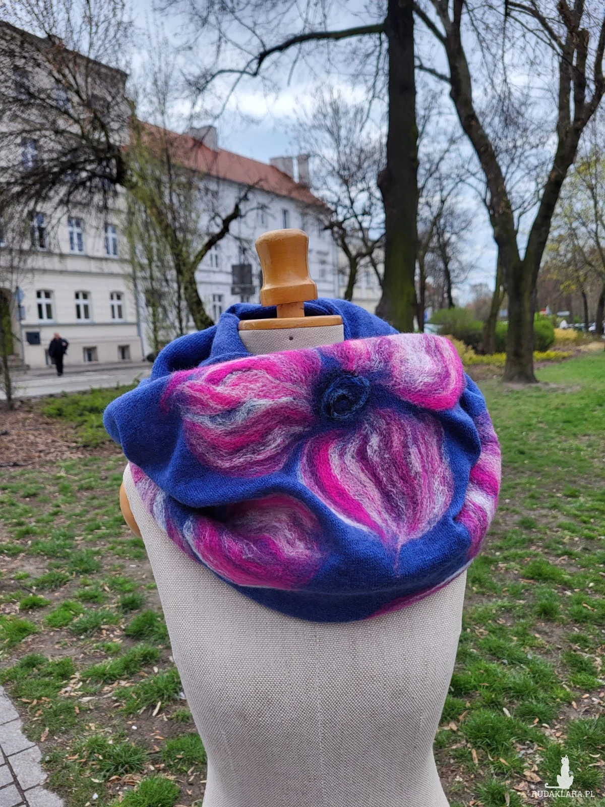 Super prezent na dzień mamy niebieski filcowany wełniany miły i ciepły komin handmade, zdjęcie trochę przekłamuje kolor ten granat jest bardziej podobny do jeansu tak jak na zdjęciu dołączonym przykładowym- tuba, owijany dwa razy, filcowany wełną merynosów, bardzo ciepły i miły, doskonały na prezent, fantastyczny na codzienne noszenie, zwraca uwagę, dodaje koloru, nie zginiesz w tym kominie na ulicy, pojedyncze egzemplarze, polecam bestseller- Ruda Klara-czas oczekiwania 1,5 tyg