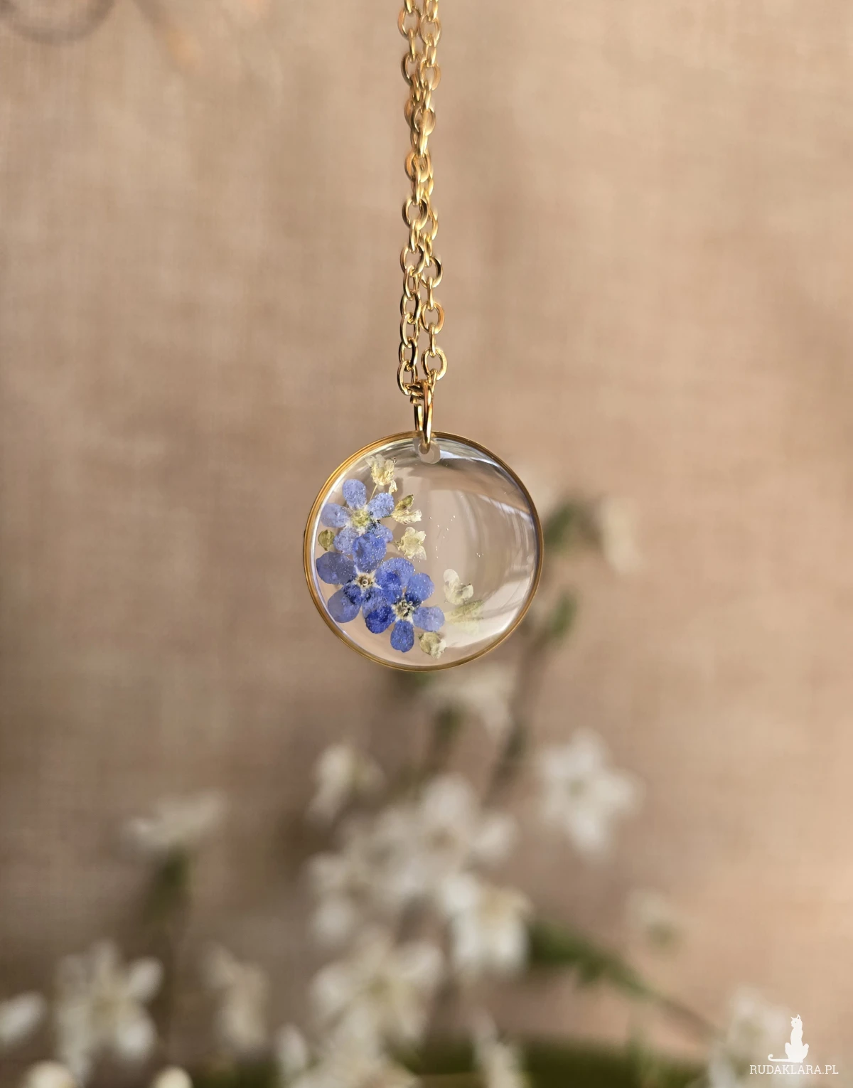 Oferuję Państwu unikalną biżuterię. Zawieszka jest wykonana z suszonych kwiatów i żywicy epoksydowej. Biżuteria jest wspaniałym i oryginalnym prezentem na lata.