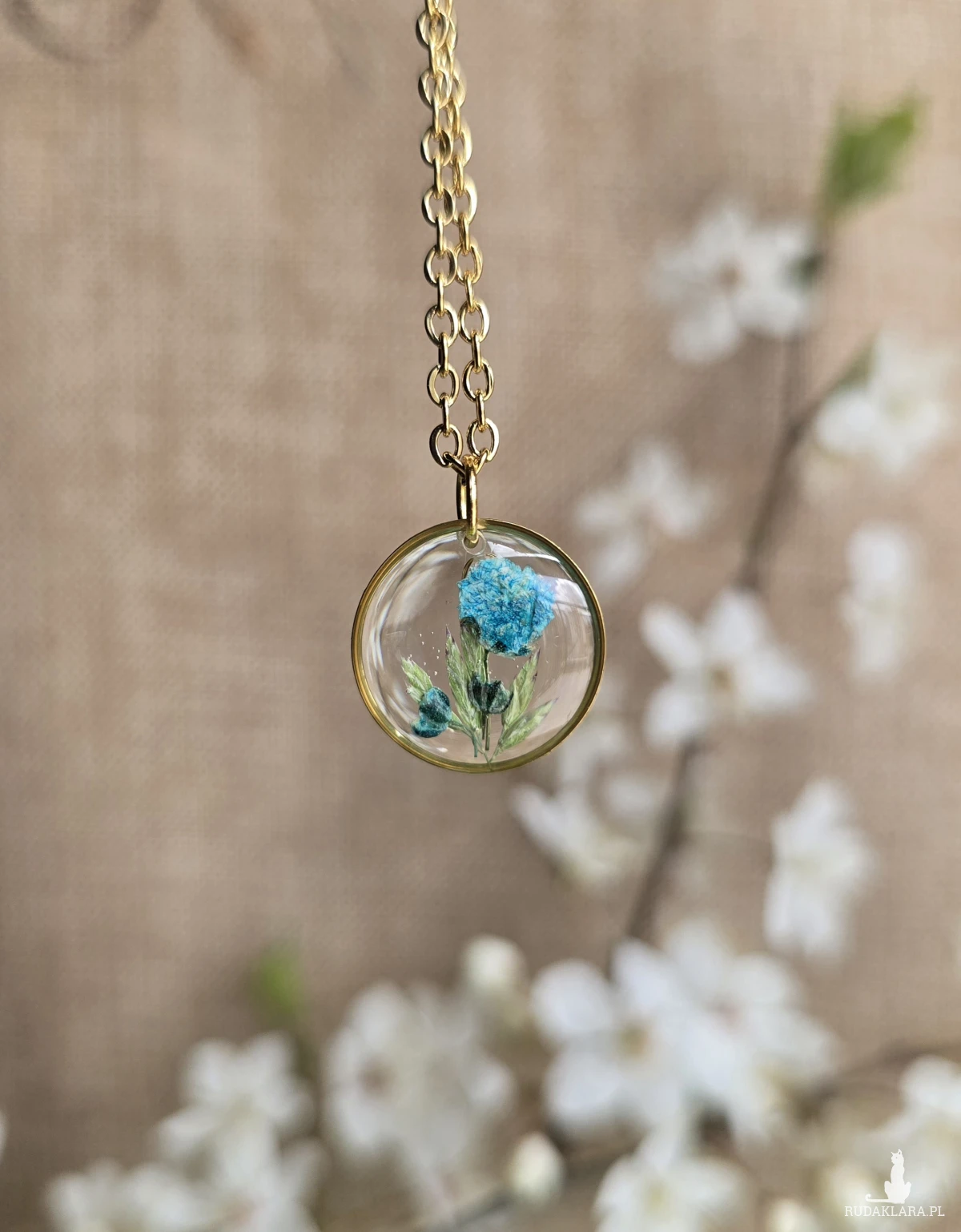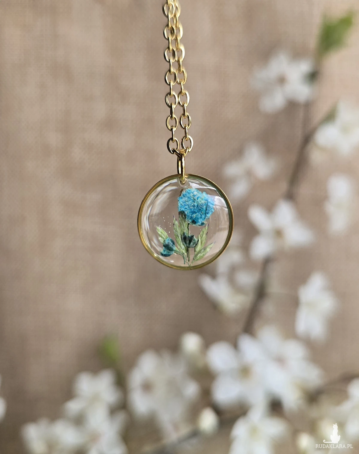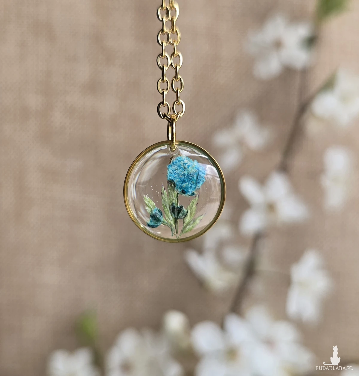 Oferuję Państwu unikalną biżuterię. Zawieszka jest wykonana z suszonych kwiatów i żywicy epoksydowej. Biżuteria jest wspaniałym i oryginalnym prezentem na lata.