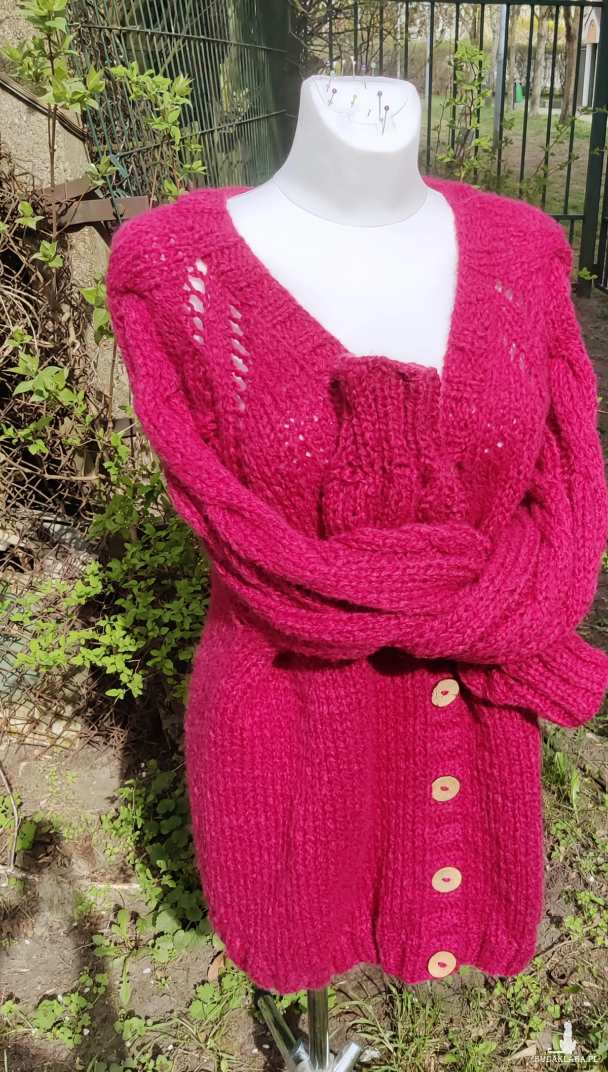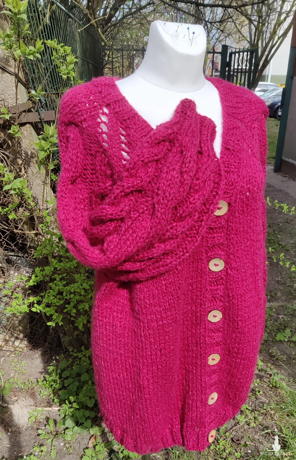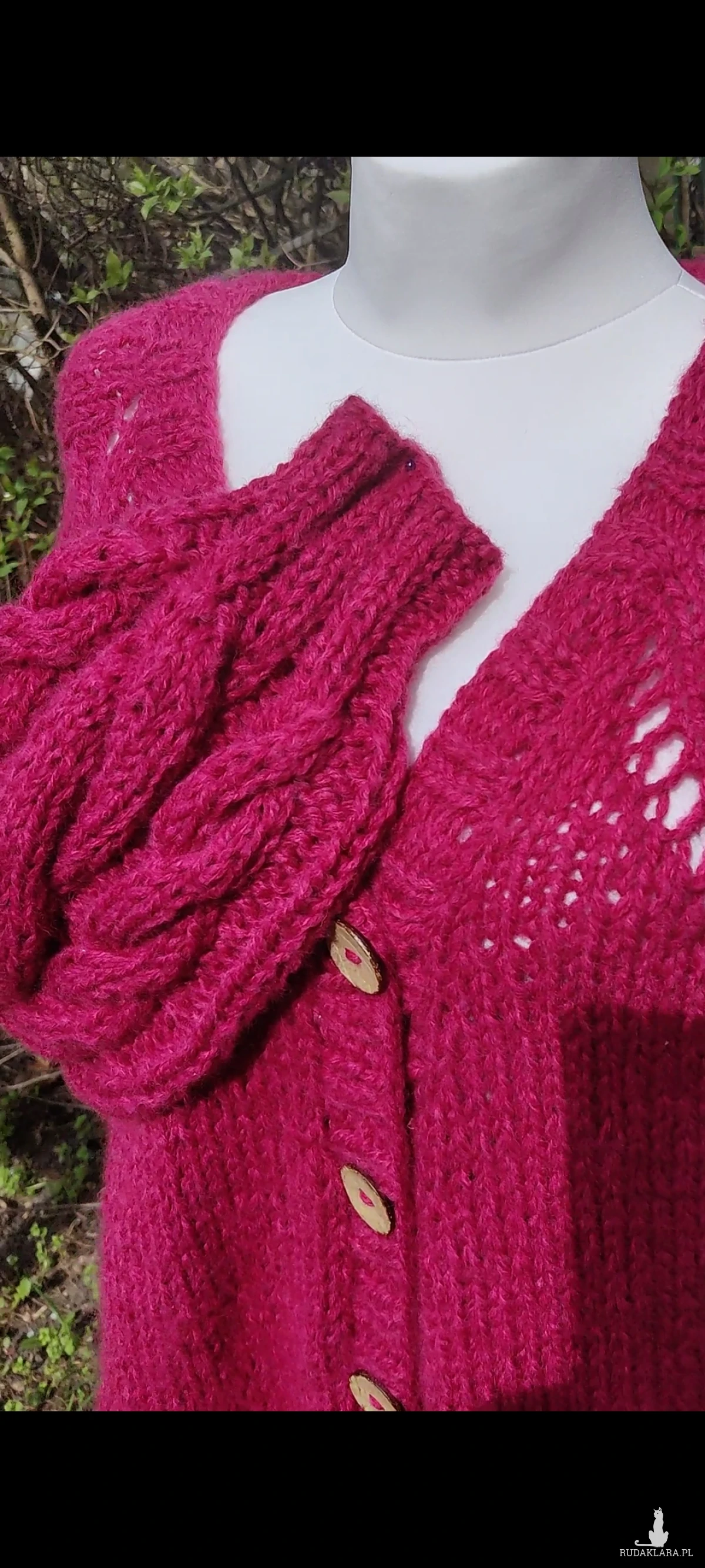 Sweterek w kolorze zgaszonej fuksji ma piękne szerokie rękawy z warkoczami.