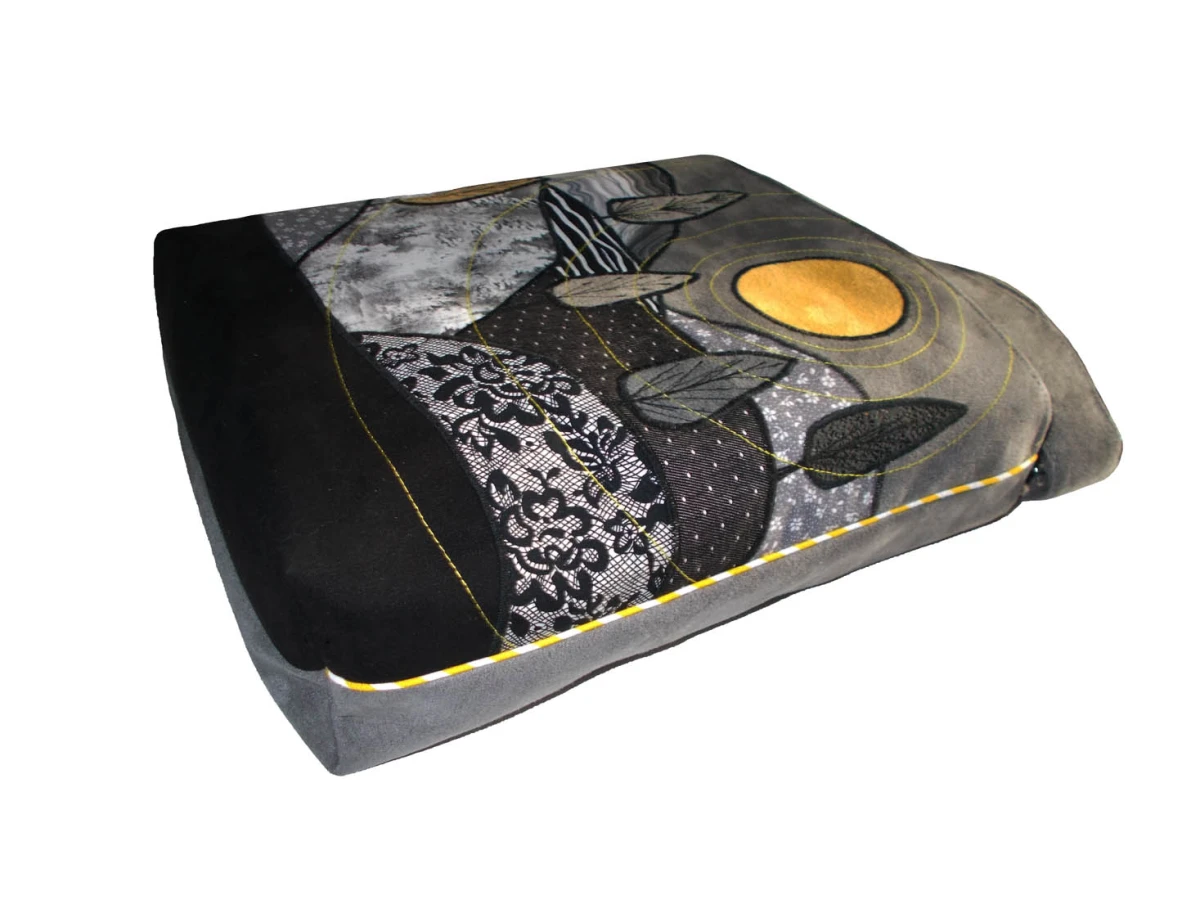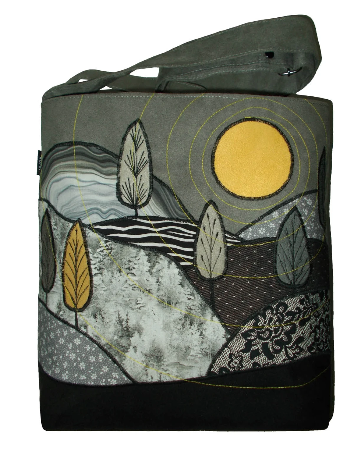 NIEPOWTARZALNA, jedna jedyna, autorska torba z eko zamszu. Tył torby w kolorze paska (szary). Pasek z tego samego materiału co całość, z regulacją, wzmocniony nitami, okucia srebrne. Przód zdobią aplikacje układające się w niepowtarzalny pejzaż. Cała torba trzyma kształt. W szwach wypustka. Denko poszerzone. Całość zapinana na zamek. Jedna z wewnętrznych kieszeni jest również zapinana na zamek. Druga kieszeń pomieści telefon, długopis i notesik. szerokość 32cm, wysokość 30cm plus denko 8cm