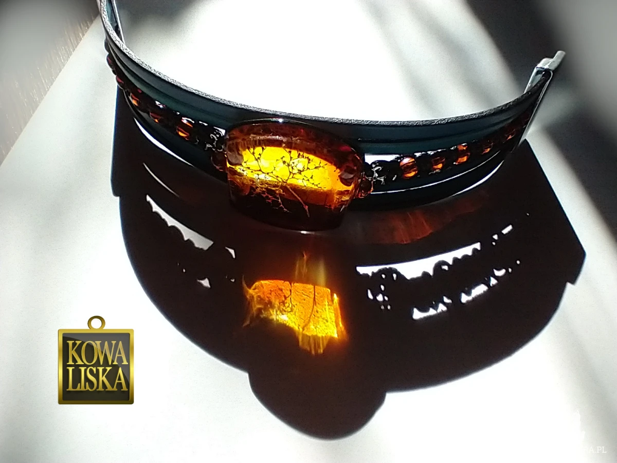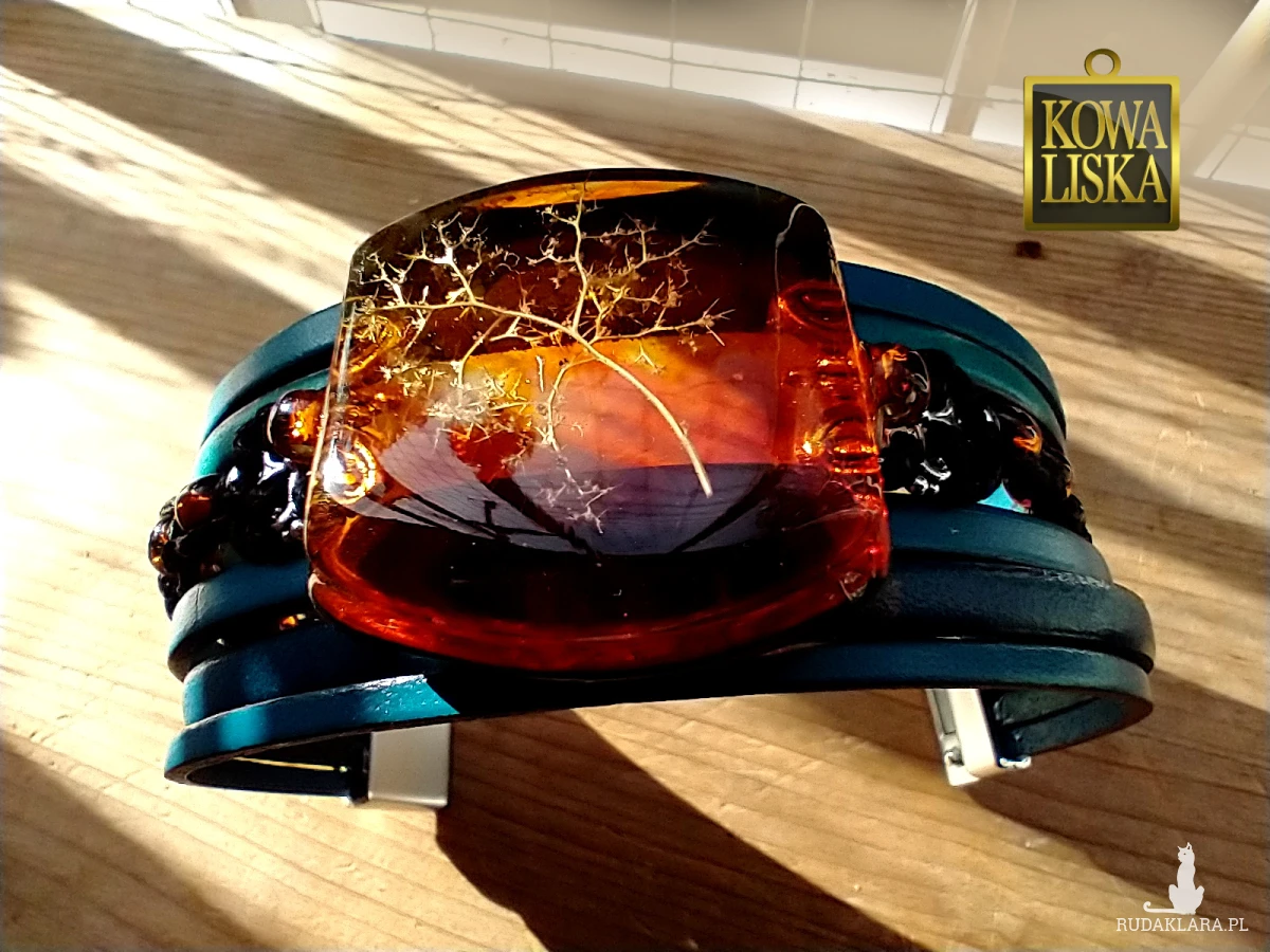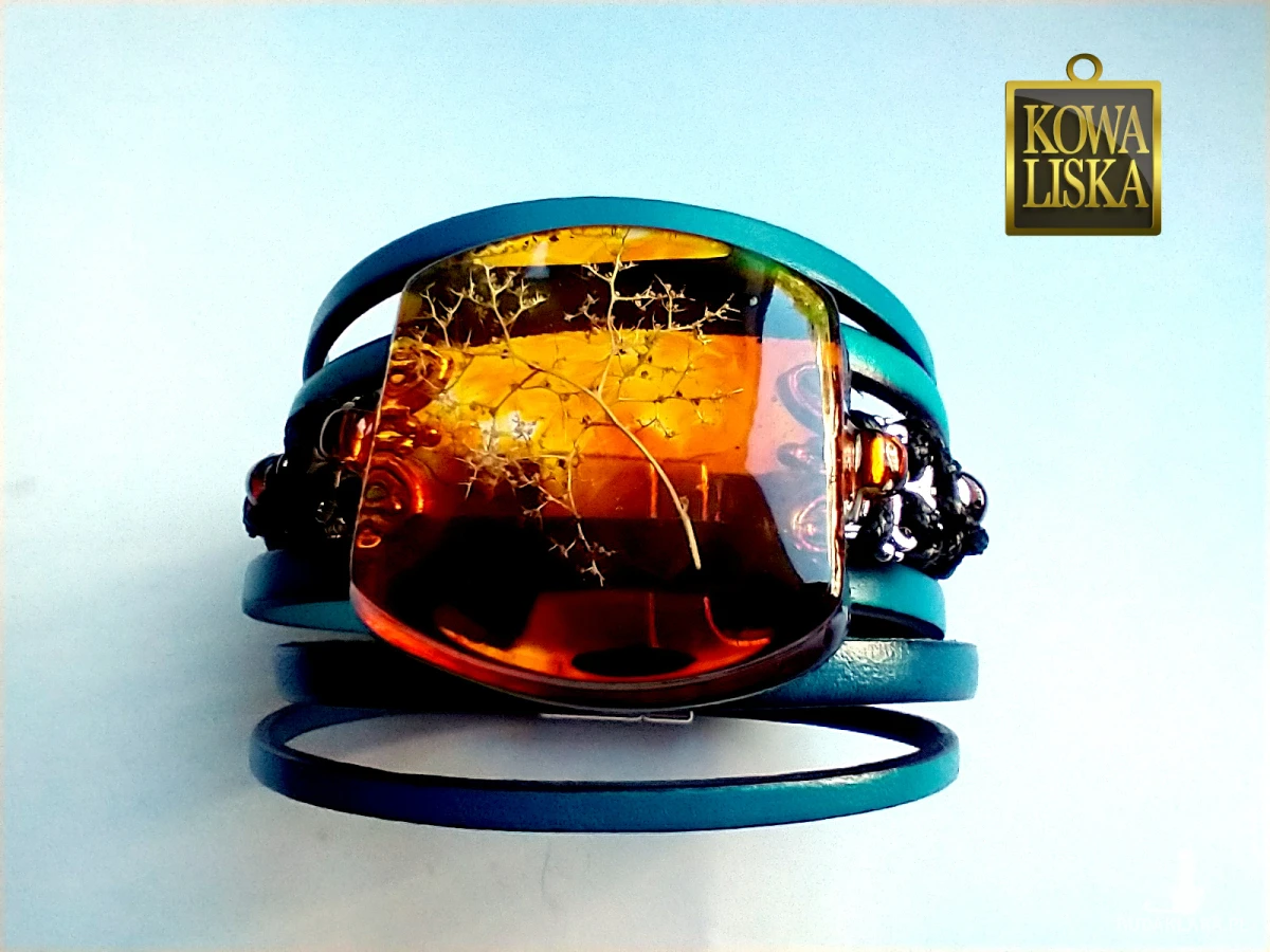 Obwód: 18,5cm, wysokość: od 30-35mm. Rzemienie naturalne, sznurek, szklane koraliki, wygodne i solidne zapięcie magnetyczne.