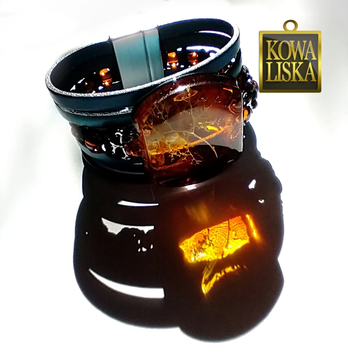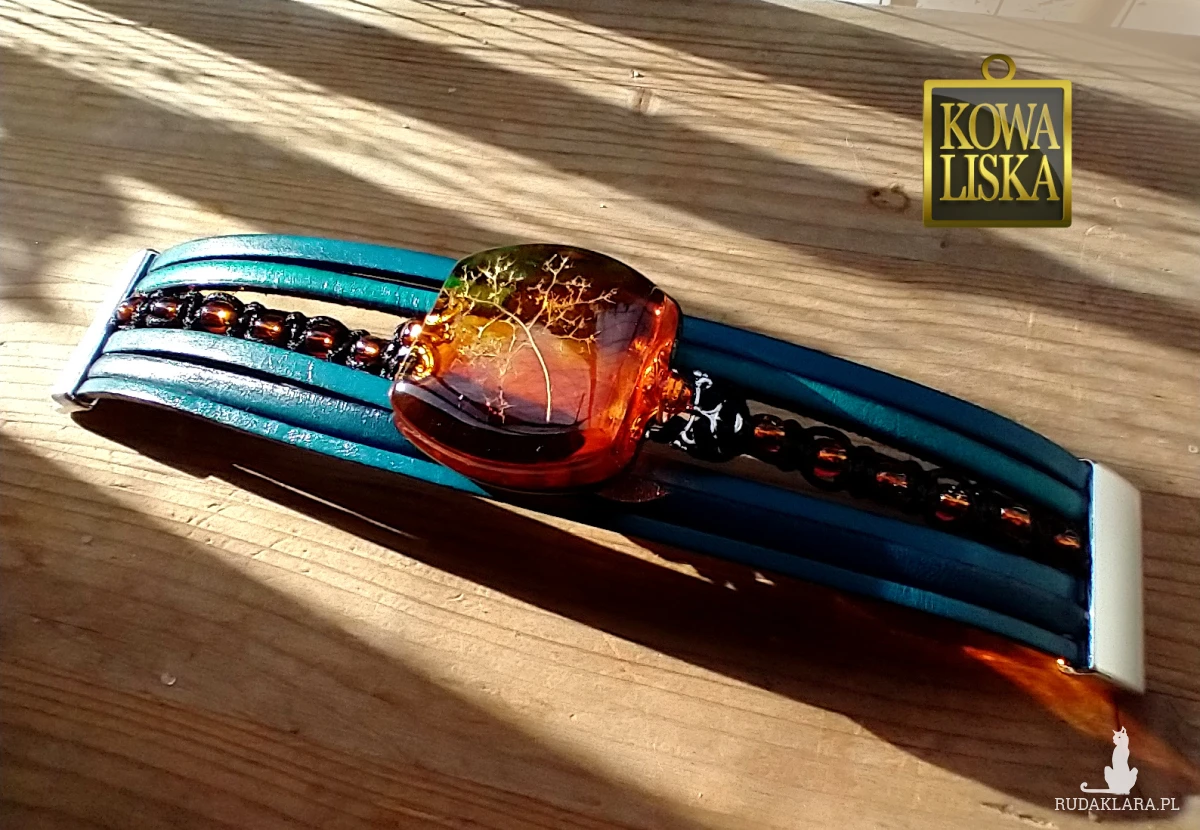 Oryginalna , ciężka bransoleta w kolorach bursztynu i turkusu.