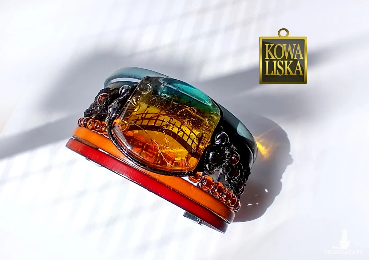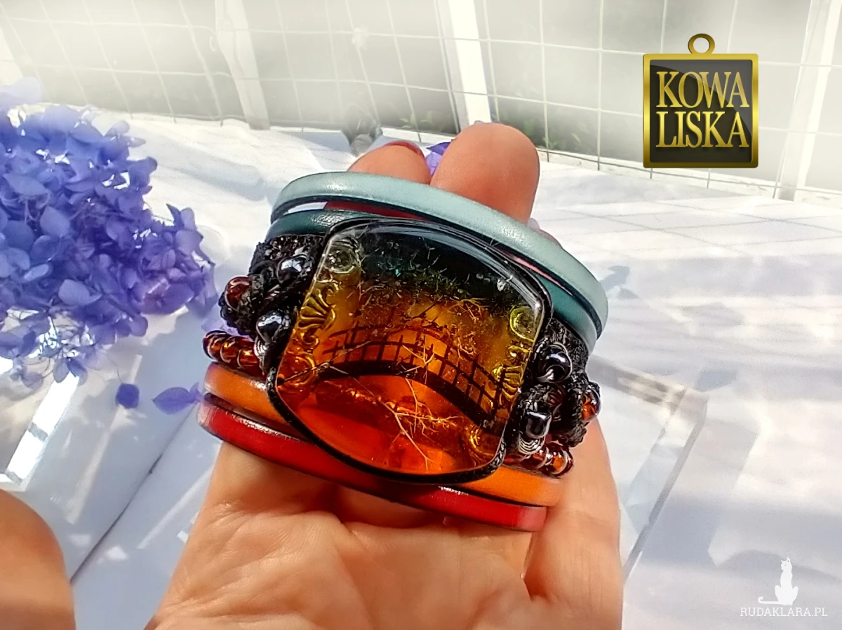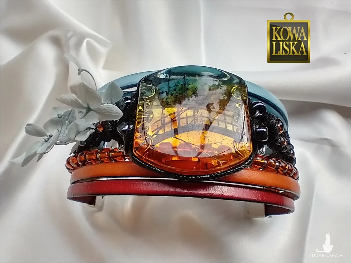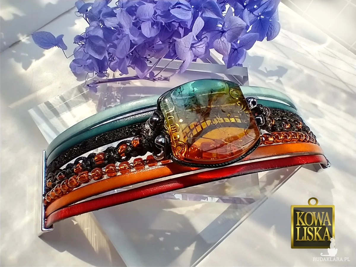 Oryginalna , bogato zdobiona i bardzo szeroka bransoletka w kolorach bursztynu, słońca i gorącego lata.