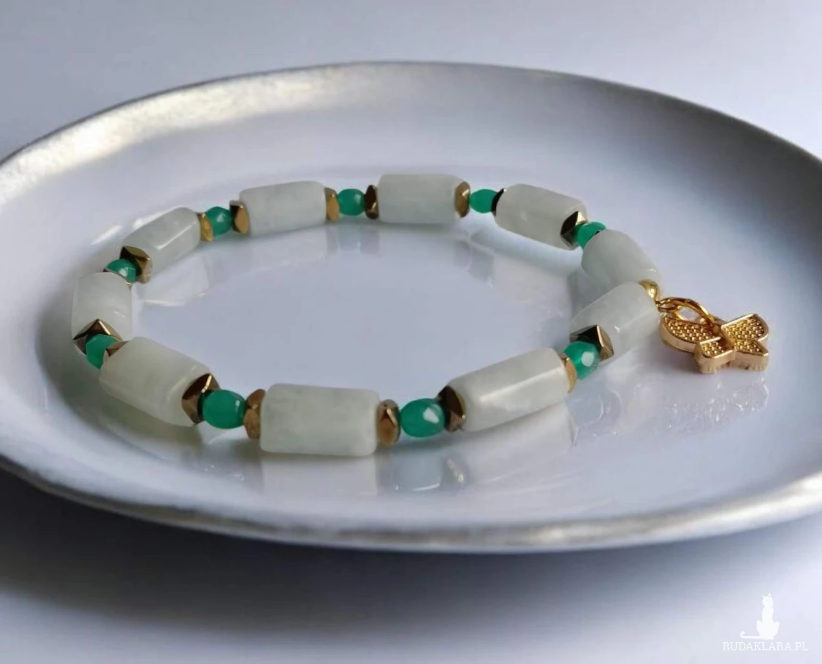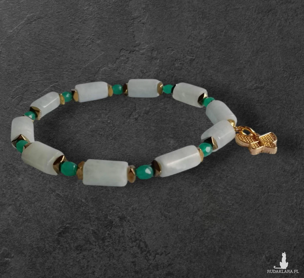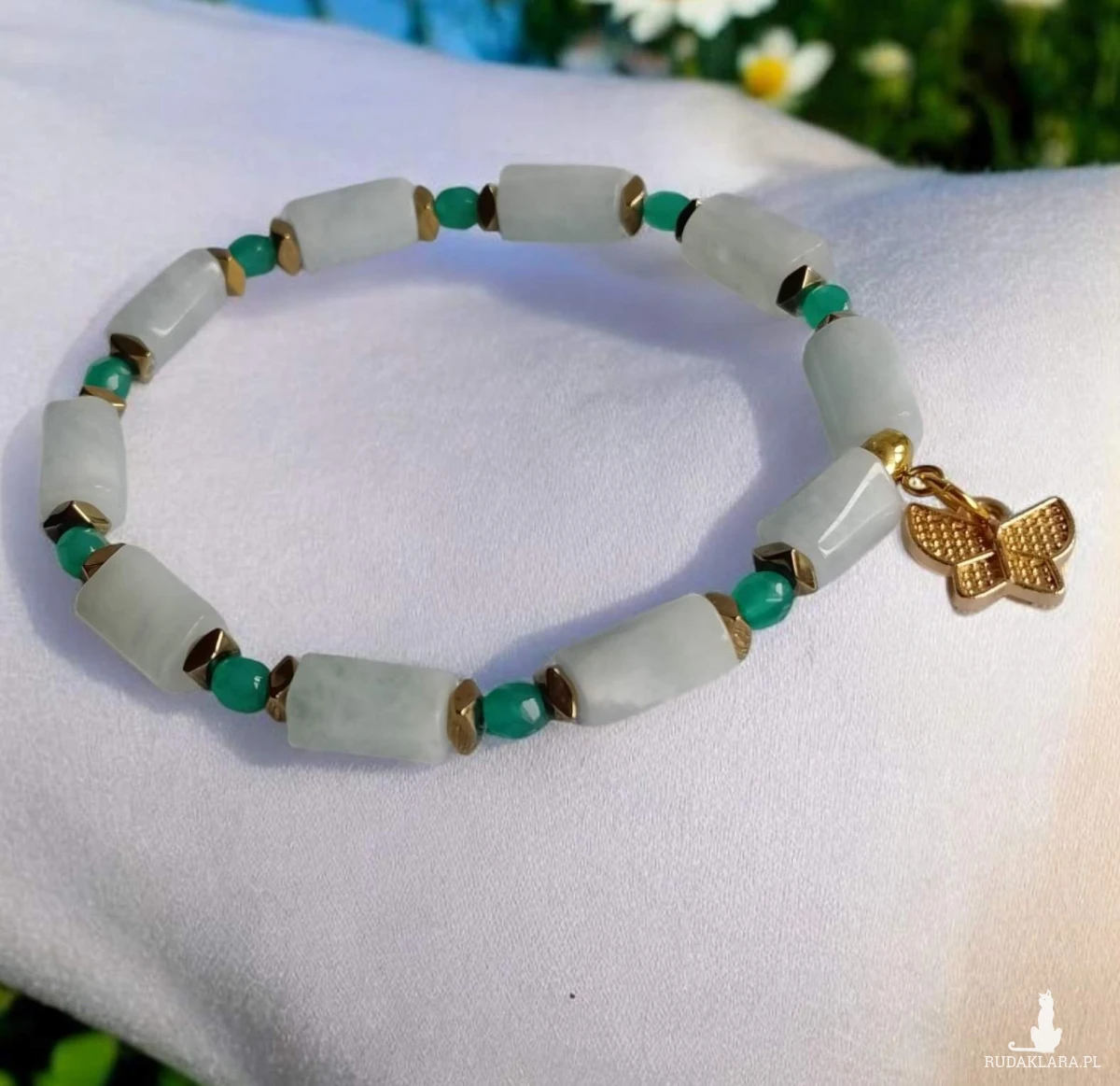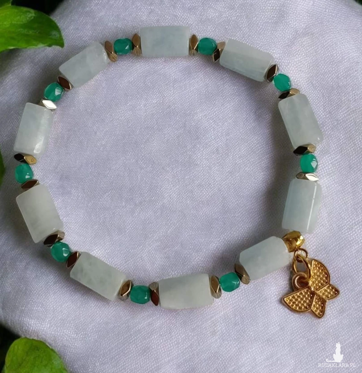 Bransoletka na żyłce silikonowej wykonana z fasetowanych walców awenturynu w rozmiarze ok. 10 x 7 mm, przełożonych 3 mm kulkami jadeitu i hematytami w kolorze złotym, ozdobiona zawieszką o kształcie motylka, Średnica 6 cm.