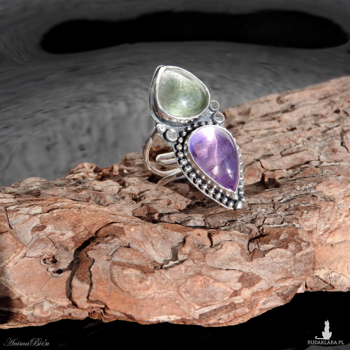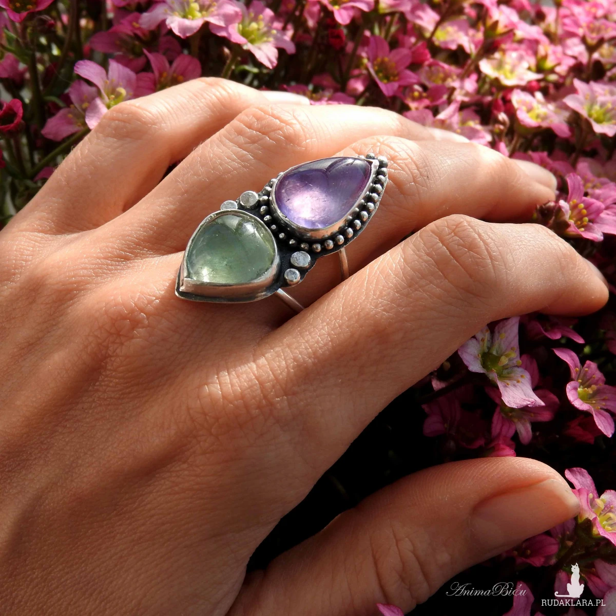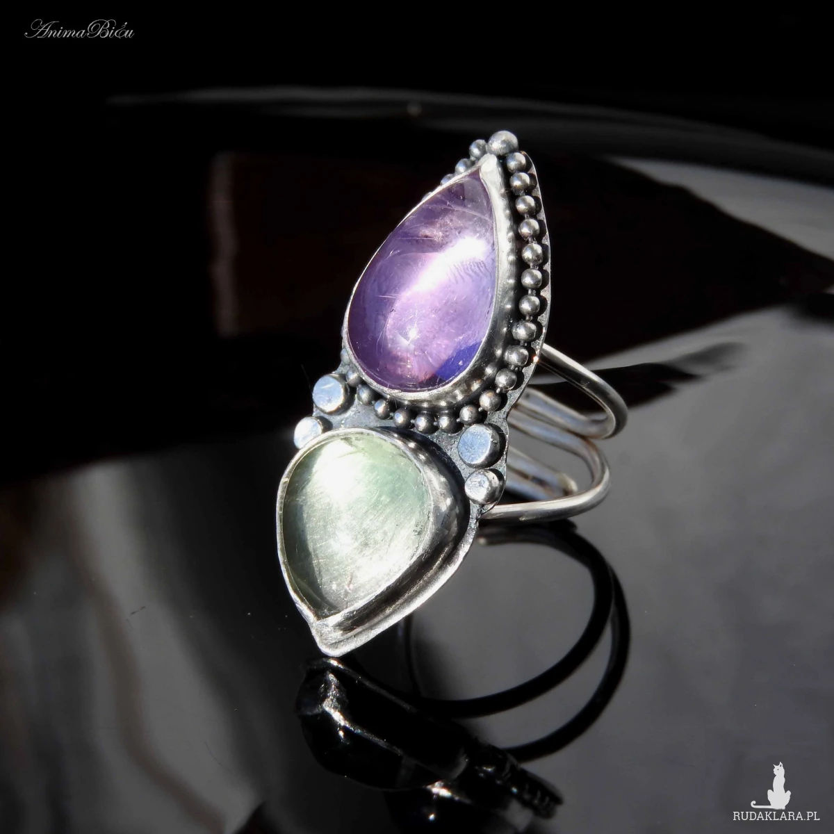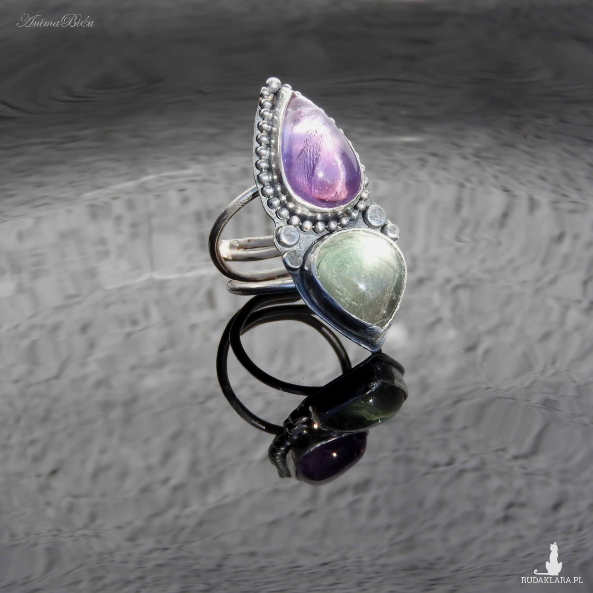 Pierścionek srebrny z ametystem i fluorytem. Wykonany od