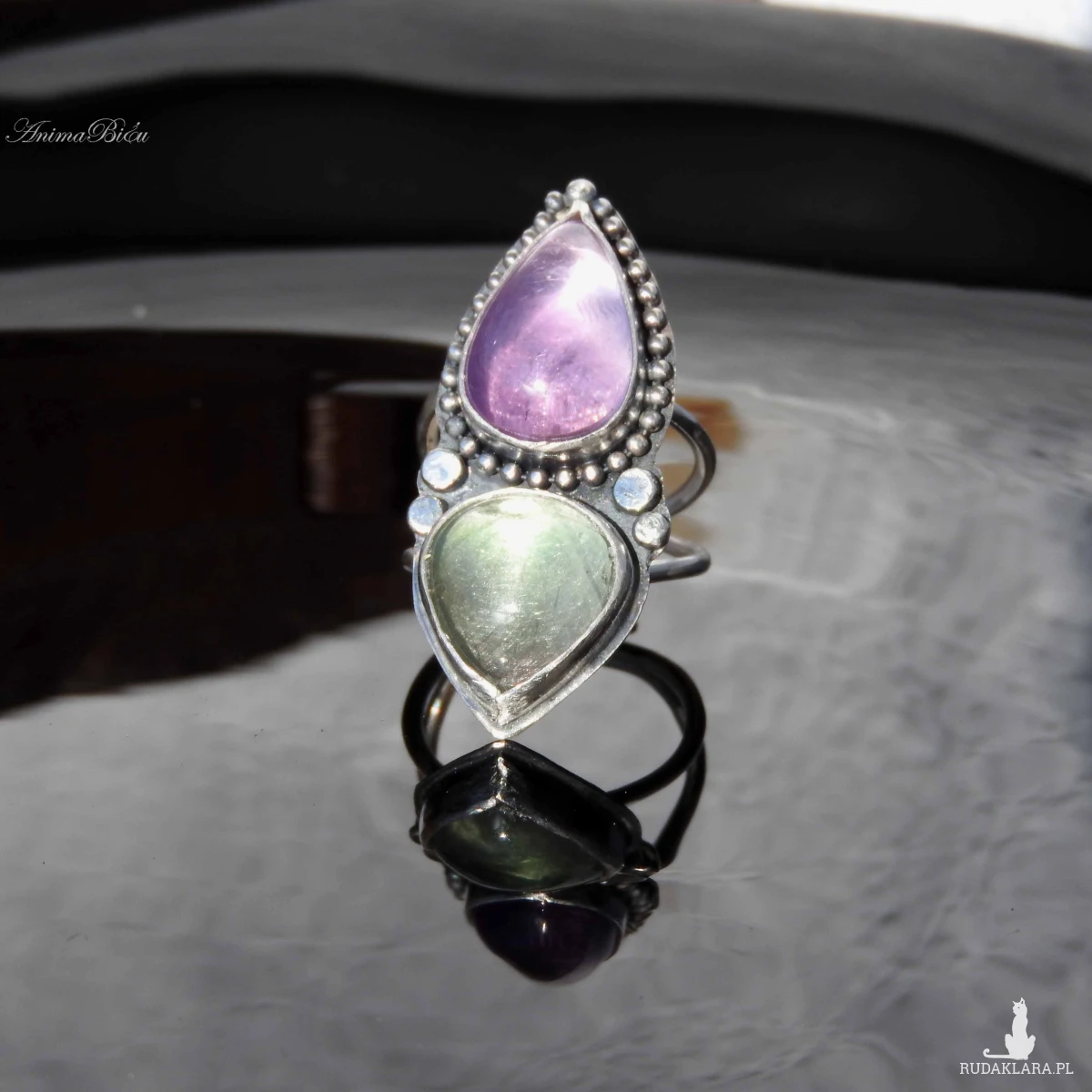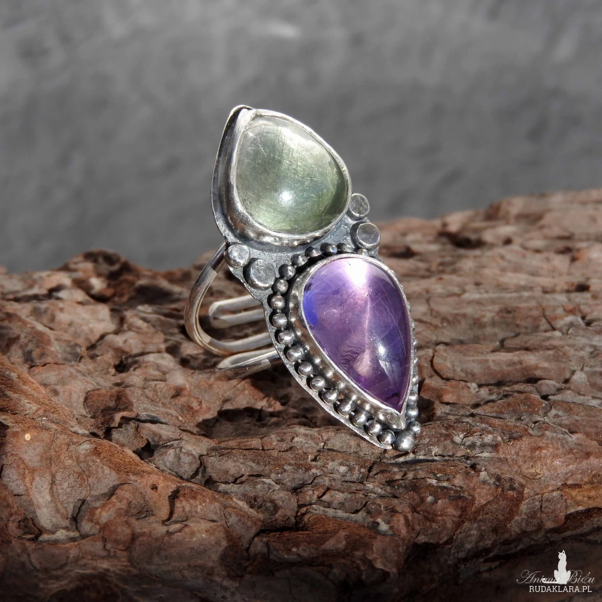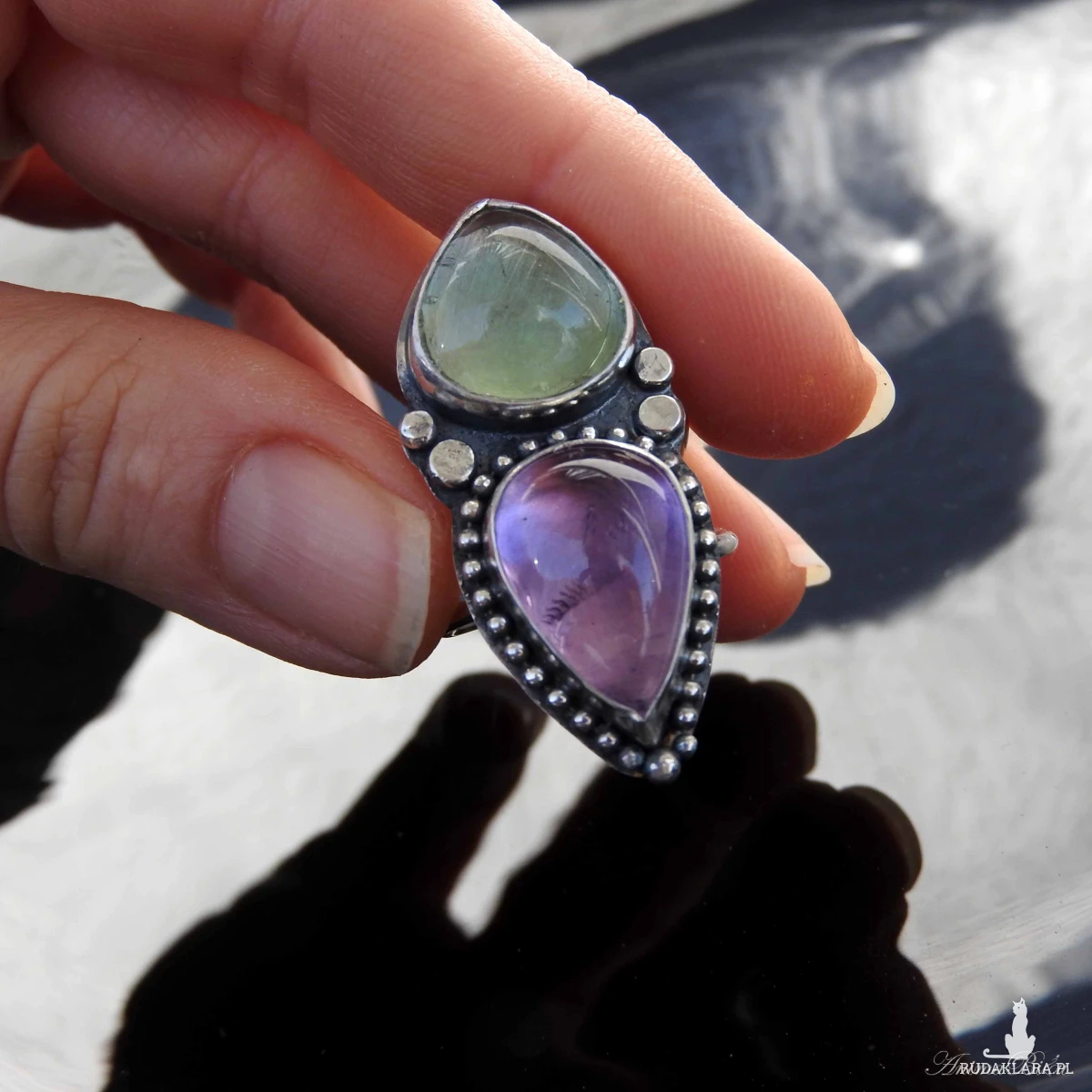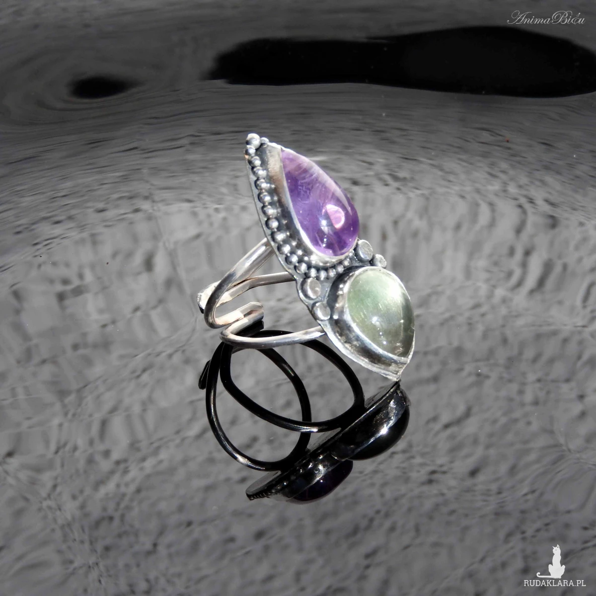 Pierścionek srebrny z ametystem i fluorytem. Wykonany od