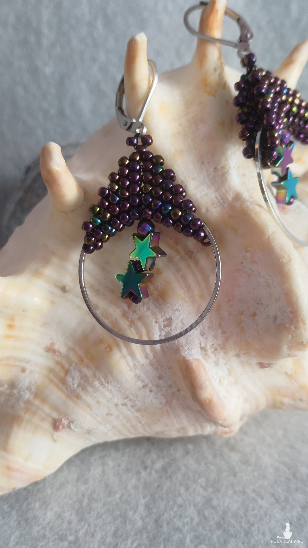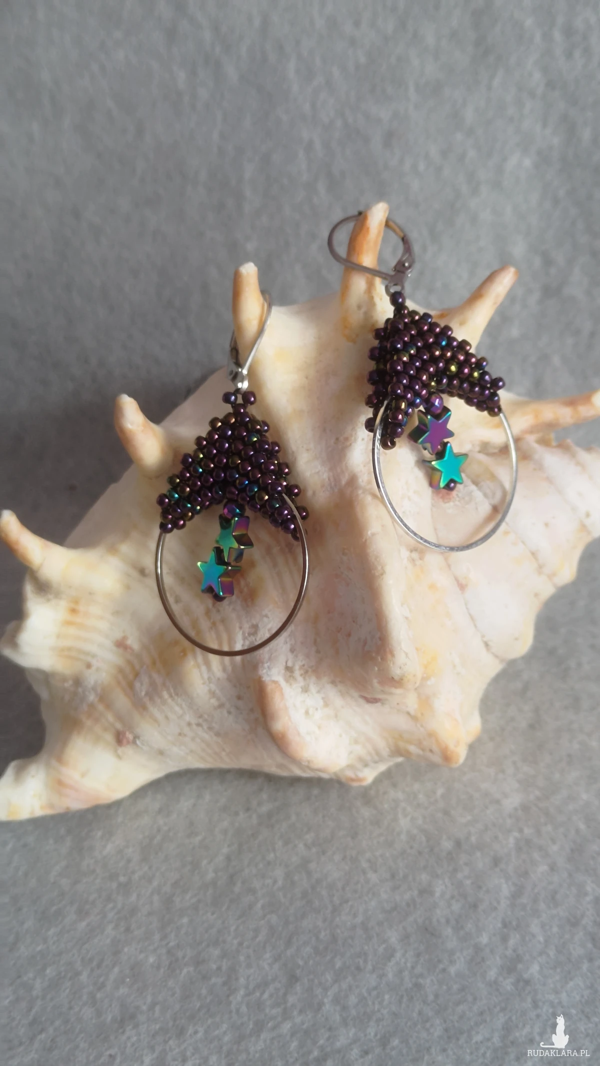 Kolczyki wykonane są z japońskich koralików toho techniką beadingu na okrągłej bazie o średnicy 3,5 cm. Koraliki są w odcieniach koloru fioletowego, całości dopełniają kolorowe gwiazdeczki z hematytu. Kolczyki zawieszone są na biglach angielskich ze stali chirurgicznej.