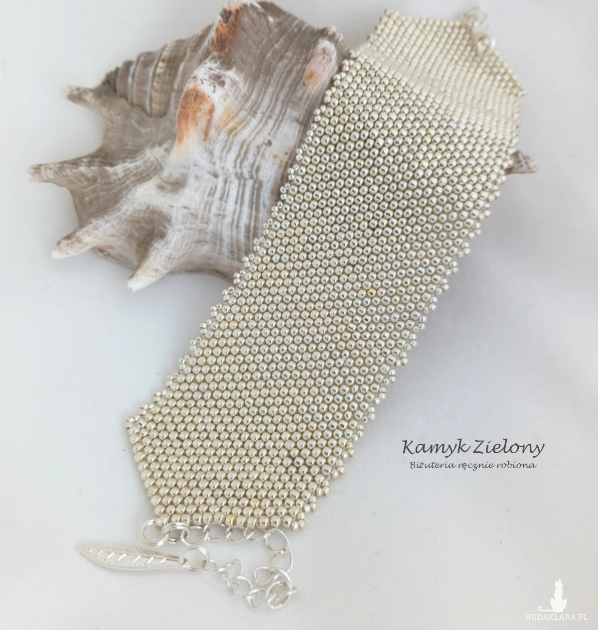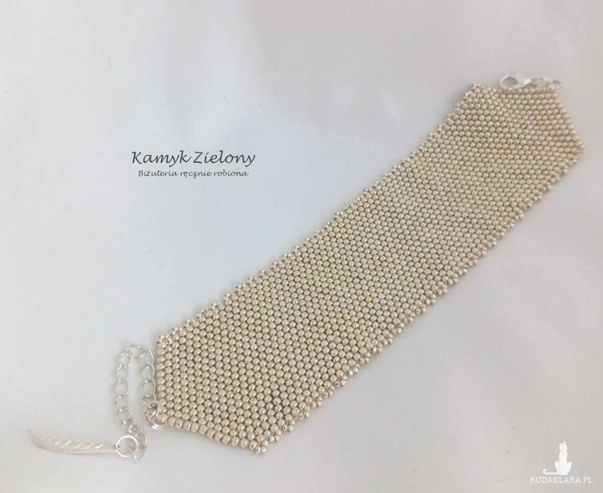 Szeroka, mankietowa bransoletka uszyta ręcznie z wysokiej jakości japońskich, szklanych koralików Toho w kolorze jasnego srebra. Do jej wykonania użyto koralików o odcieniu Galvanized Aluminium - z trwałą, metaliczną powłoka, która została naniesiona na szklane koraliki w procesie produkcji metodą galwanizowania. Dzięki temu kolor koralików jest bardzo trwały - nie ściera się, ani nie ulega zmatowieniu w trakcie użytkowania biżuterii.