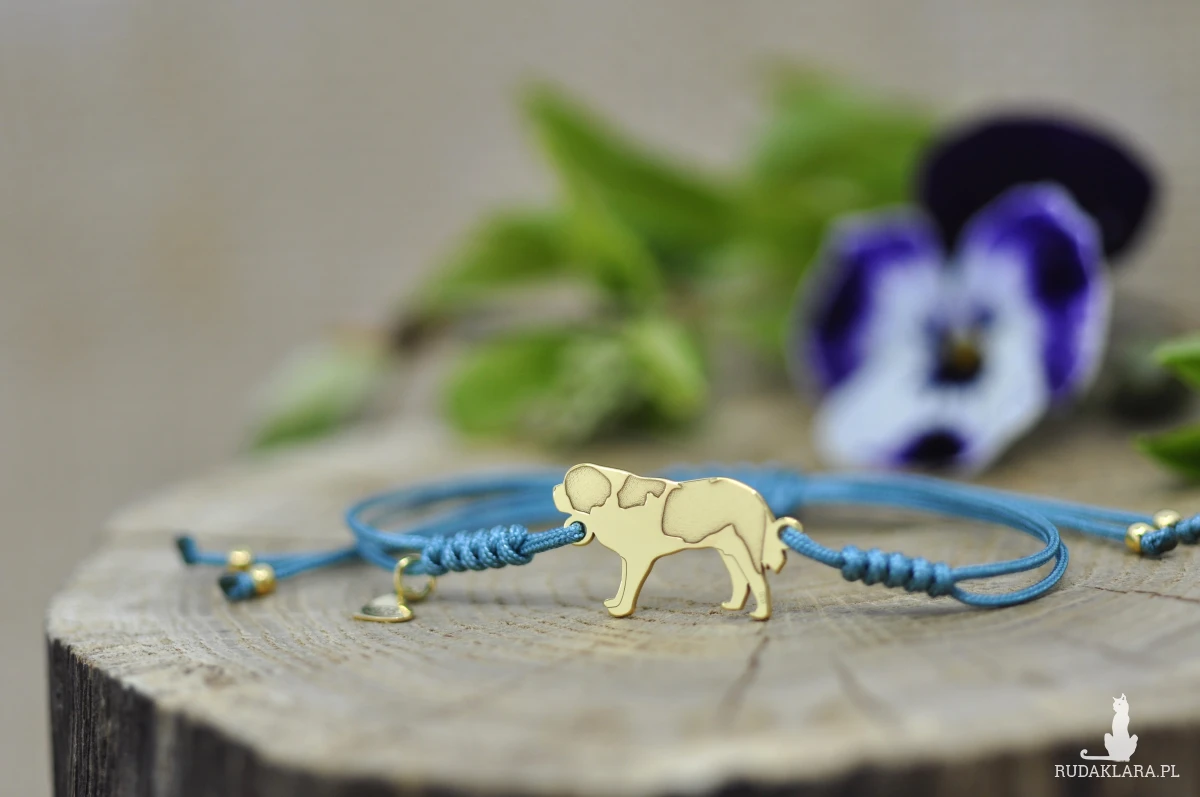 Bernardyn wykonany ze srebrnej blachy próby 925, wymiary pieska: 21,4 x 12,6 mm, grubość 0,8 mm, srebrne kulki.