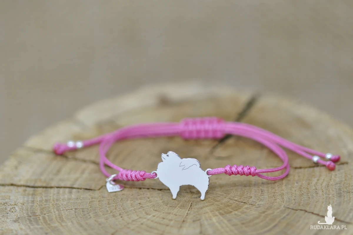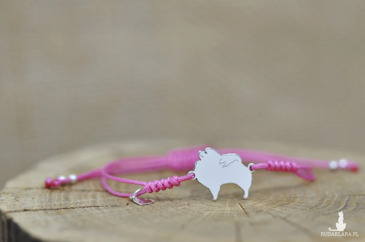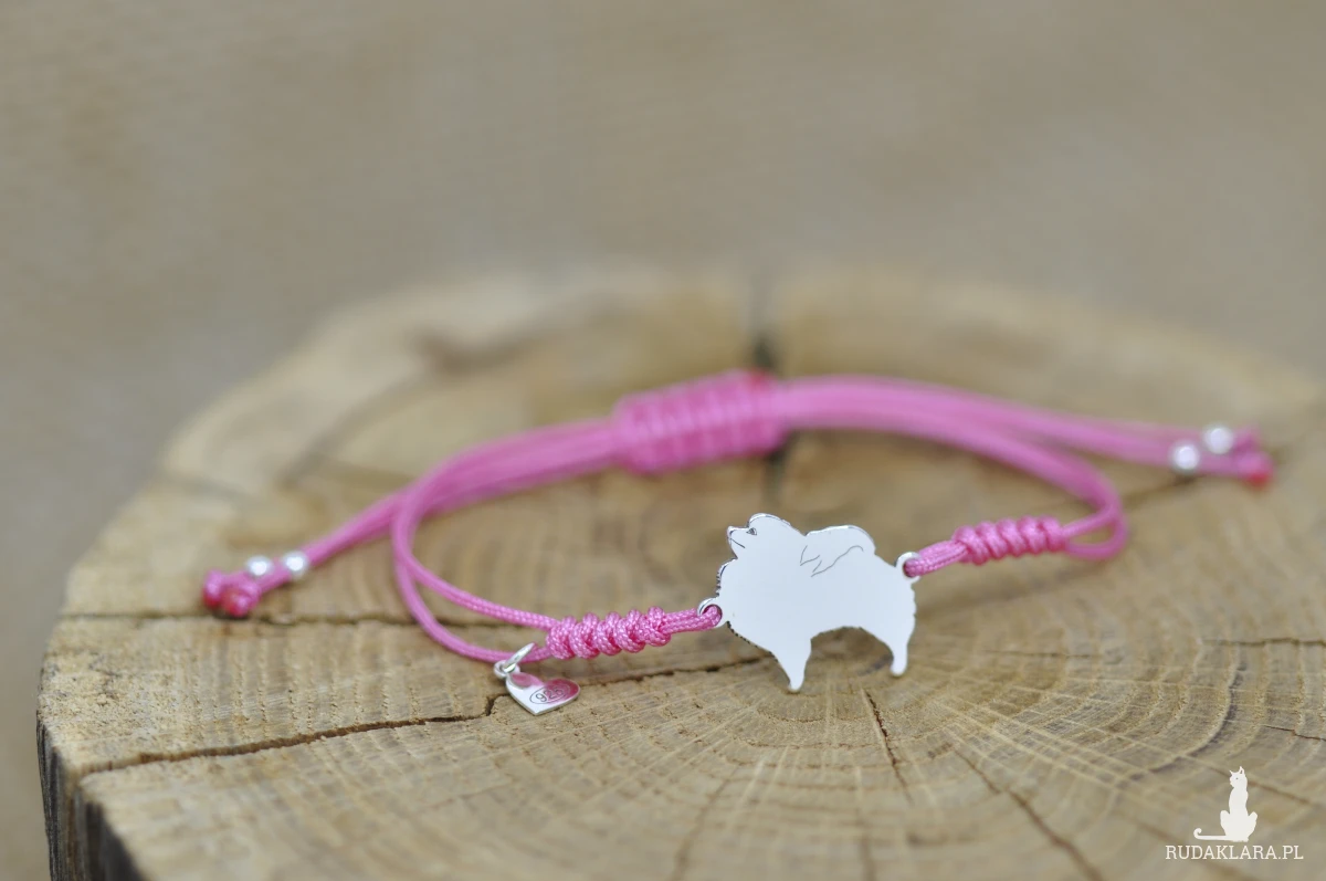 Szpic wykonany ze srebrnej blachy próby 925, wymiary pieska: 19 x 15,2 mm, grubość 0,8 mm oraz srebrne serduszka i kulki.