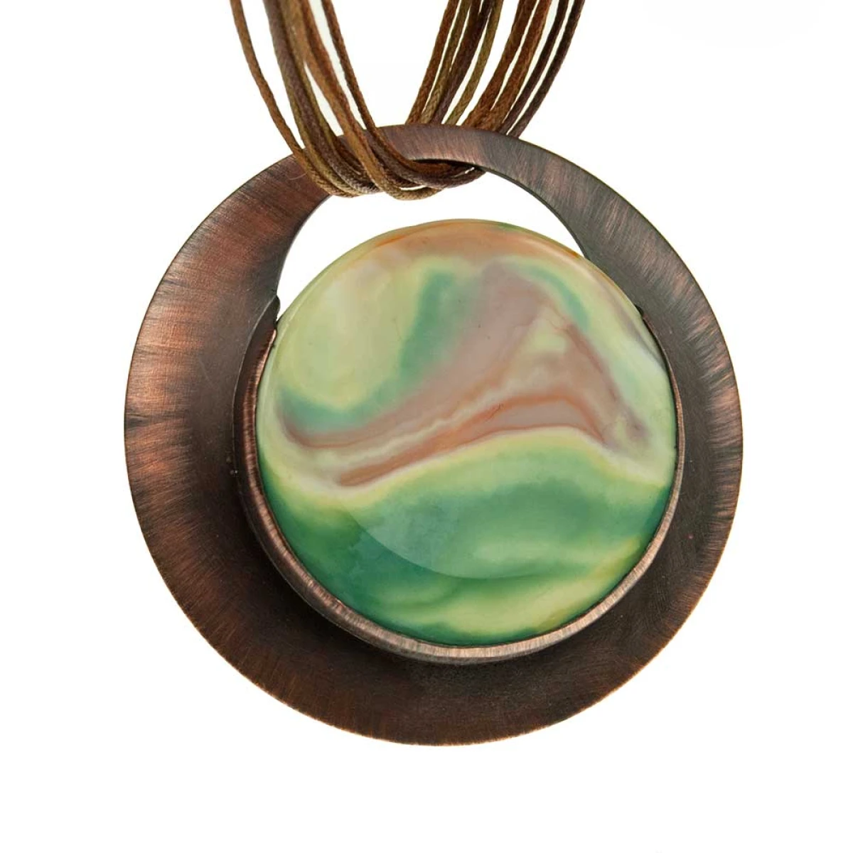 Przedstawiony wisior wykonany został z miedzi i agatu o średnicy ok. 40-45 mm. W procesie tworzenia wisiora blacha była polerowana, matowiona, a następnie malowana oksydą i przecierana, dzięki czemu powstał niepowtarzalny efekt kolorystyczny. Blacha otaczająca agat jest lekko wypukła oraz zabezpieczona warstwą ochronną. Miedziane koło, którego centralnym elementem jest niepowtarzalny agat, ma średnicę ok 7 cm.