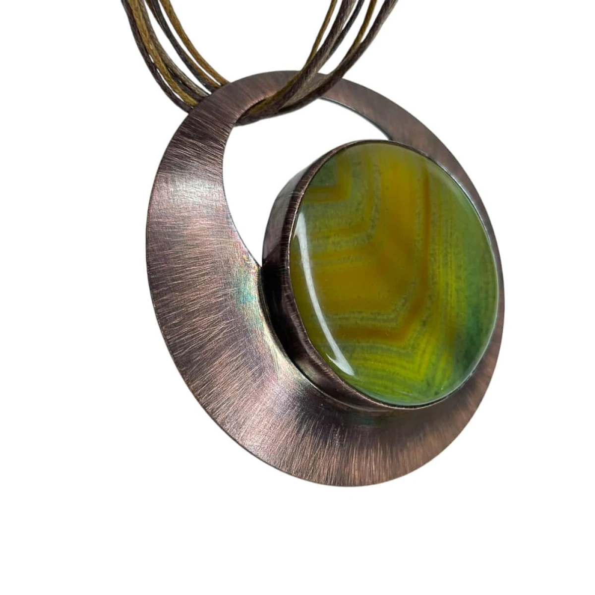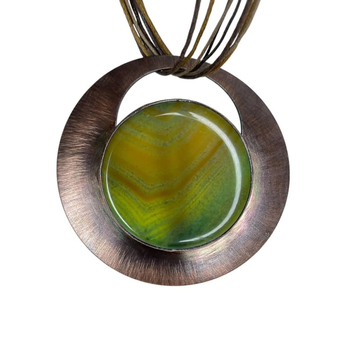 Przedstawiony wisior wykonany został z miedzi i agatu o średnicy ok. 40-45 mm. W procesie tworzenia wisiora blacha była polerowana, matowiona, a następnie malowana oksydą i przecierana, dzięki czemu powstał niepowtarzalny efekt kolorystyczny. Blacha otaczająca agat jest lekko wypukła oraz zabezpieczona warstwą ochronną. Miedziane koło, którego centralnym elementem jest niepowtarzalny agat, ma średnicę ok 7 cm.