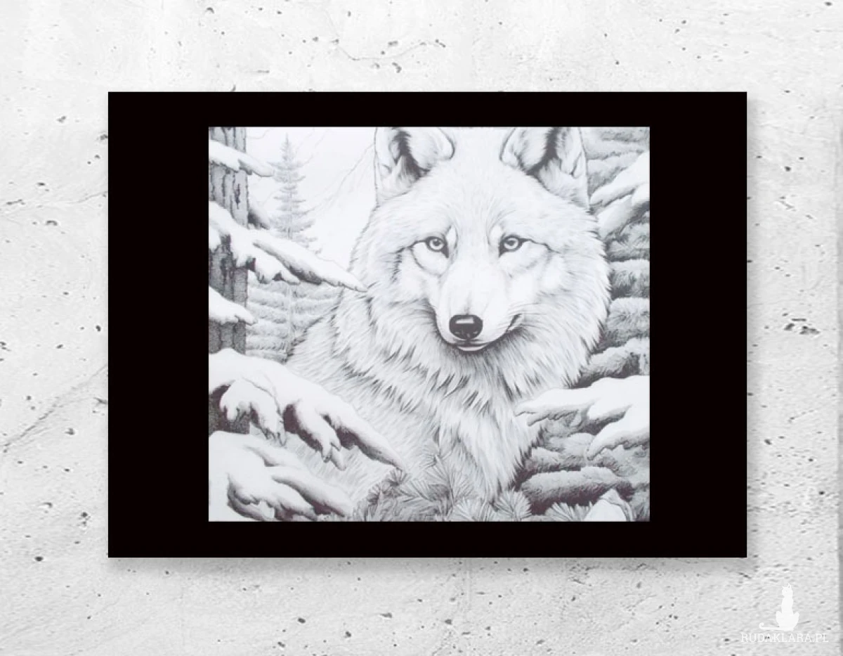 Nowy plakat w stylu retro. Obrazek z wilkiem na czarnym kartoniku A4. Plakat wystarczy tylko umieścić w antyramie lub ramce 21x30 cm. Obrazek na ścianę do sypialni, przedpokoju, salonu, gabinetu, pokoju dziecięcego lub młodzieżowego, jadalni, kuchni, biura, garderoby, holu, kawiarni, restauracji, cukierni, herbaciarni, hotelu itp. Grafika będzie pasowała do wnętrz urządzonych w stylu skandynawskim, mieszanym, vintage, rustykalnym, hygge, tradycyjnym, boho, myśliwskim, klasycznym, eklektycznym. Przedmiot do dekoracji wnętrz.