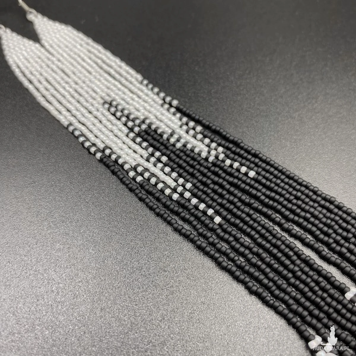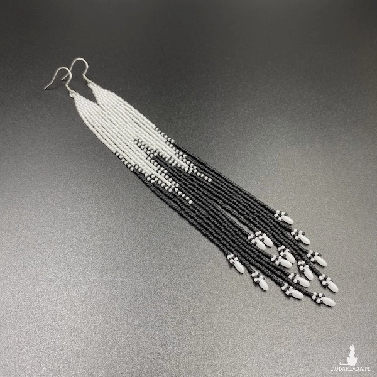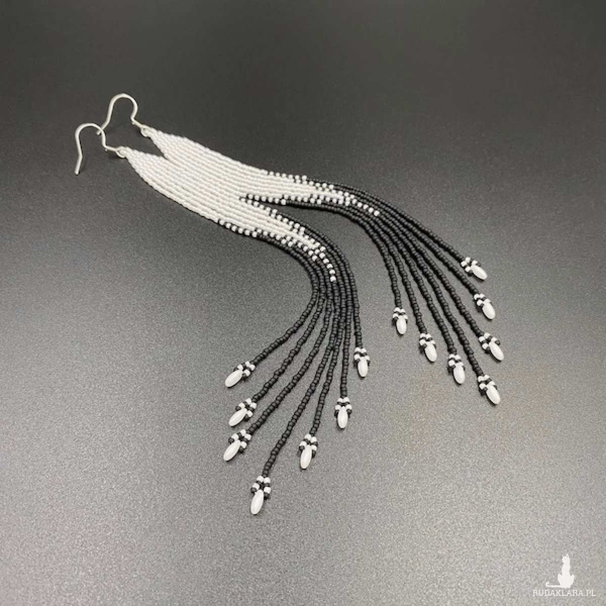 Bardzo długie i wąskie kolczyki do ramion z efektem cieniowania, zostały wykonane z najmniejszych na rynku koralików Toho 15 i Rizo. W 100% utkane ręcznie i z największą starannością.