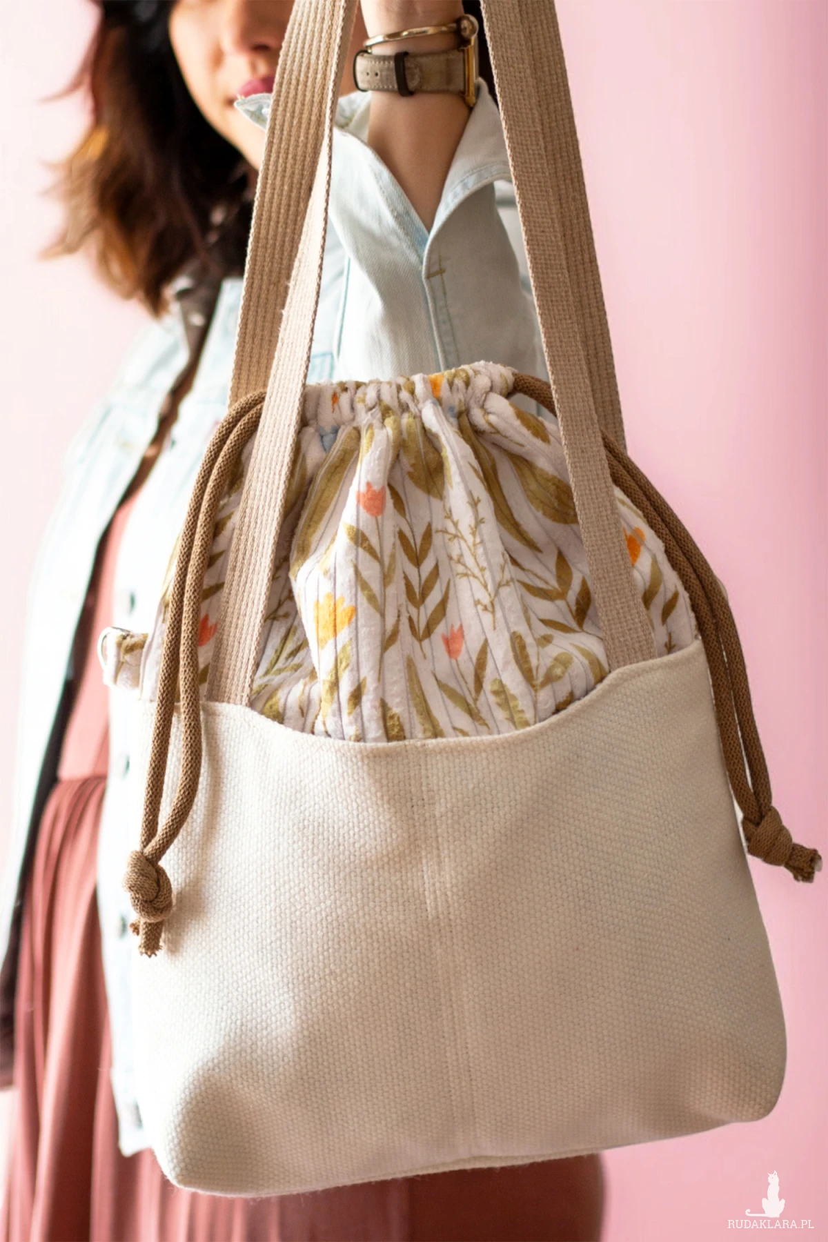 Torba worek wykonana z grubego sztruksu w kwiaty w kolorze ecru.