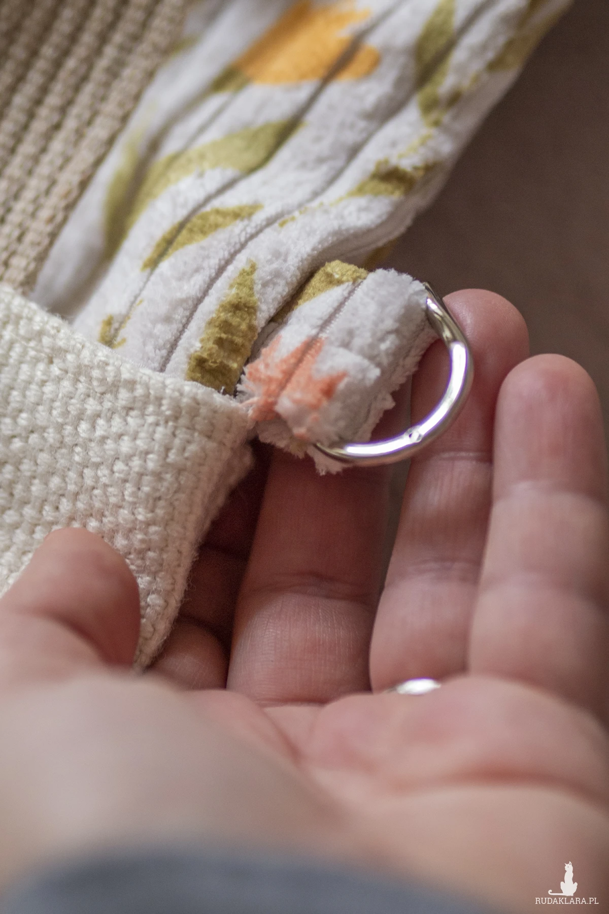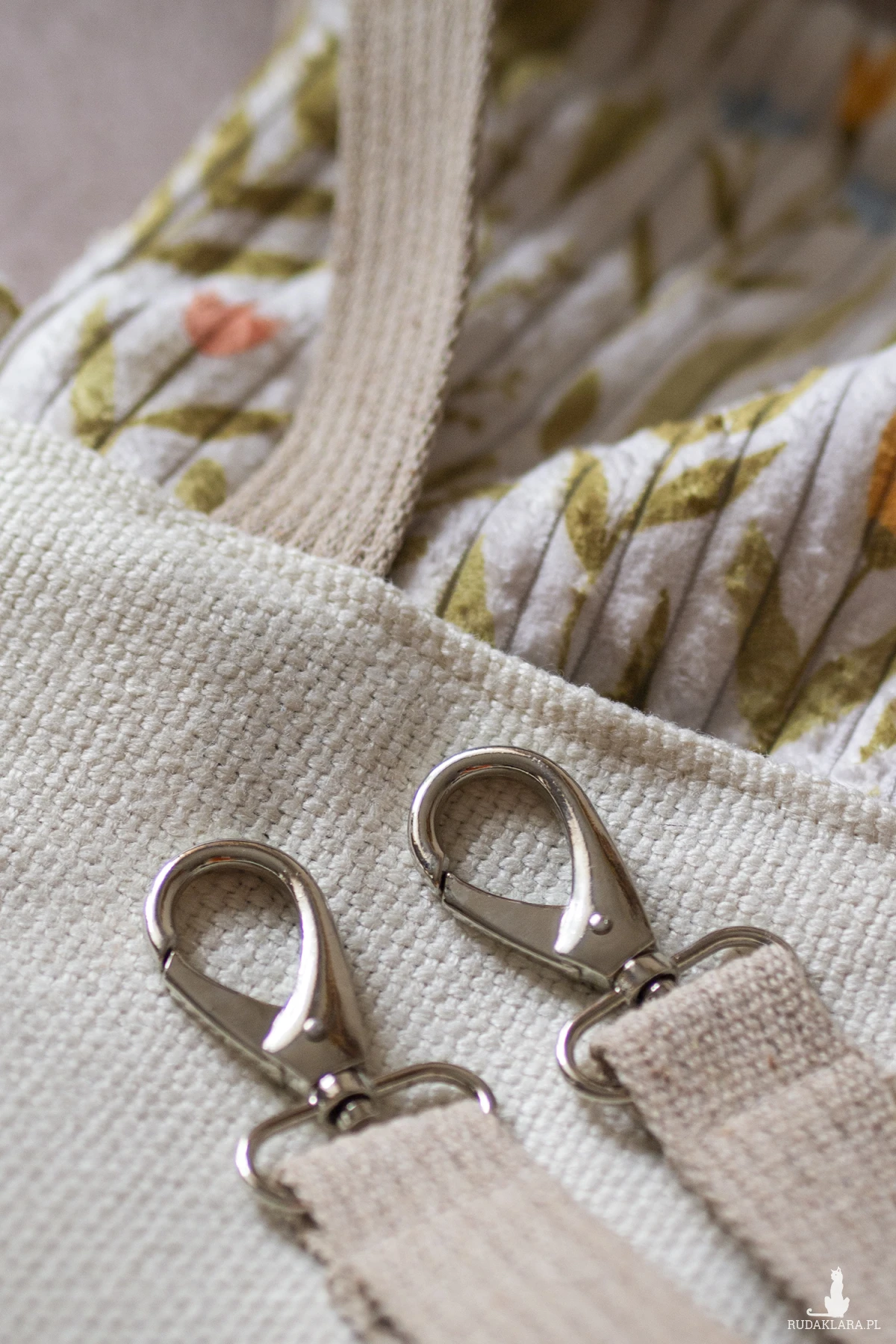 Bawełniana podszewka w kwiaty. Torbę do wózka można zamocować dzięki specjalnym bawełnianym pasom zapinanym na karabińczyki.