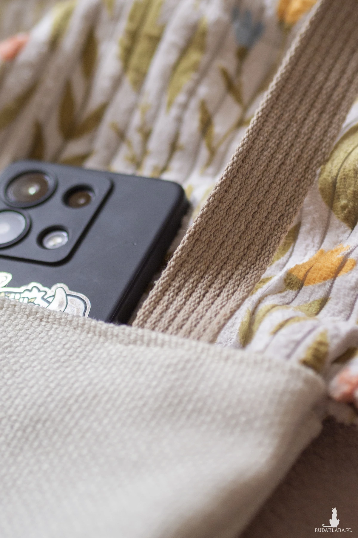 Ściągana jest jak worek bawełnianym sznurkiem w kolorze cappuccino. Dół z jasnej plecionki tkaniny daje dodatkowe miejsce na przechowywanie rzeczy - z przodu dwie mniejsze, z tyłu torby jedna duża kieszeń.
