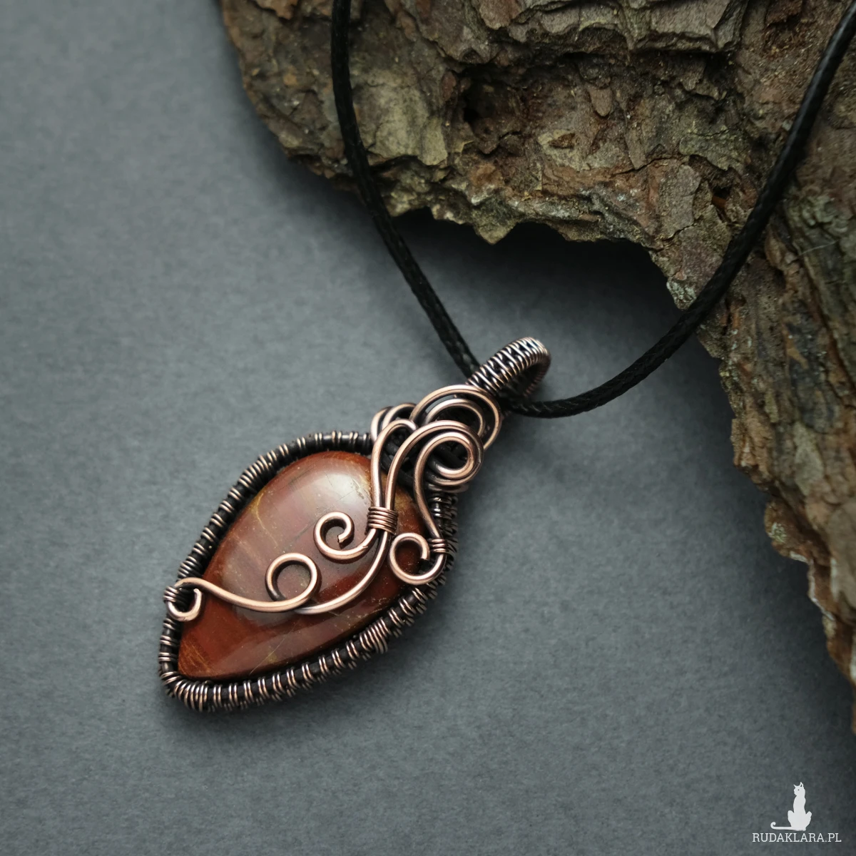 Miedziany wisiorek mieści w sobie skamieniałe drewno o brązowo-czerwonej barwie. Posiada ozdobne boczki i oplata go moc fikuśnych miedzianych splotów. Wisiorek jest unikatem, doda Twojej stylizacji oryginalności, a jeśli lubisz naturę i kolory ziemi wisiorek będzie idealnym dopełnieniem Ciebie :-)