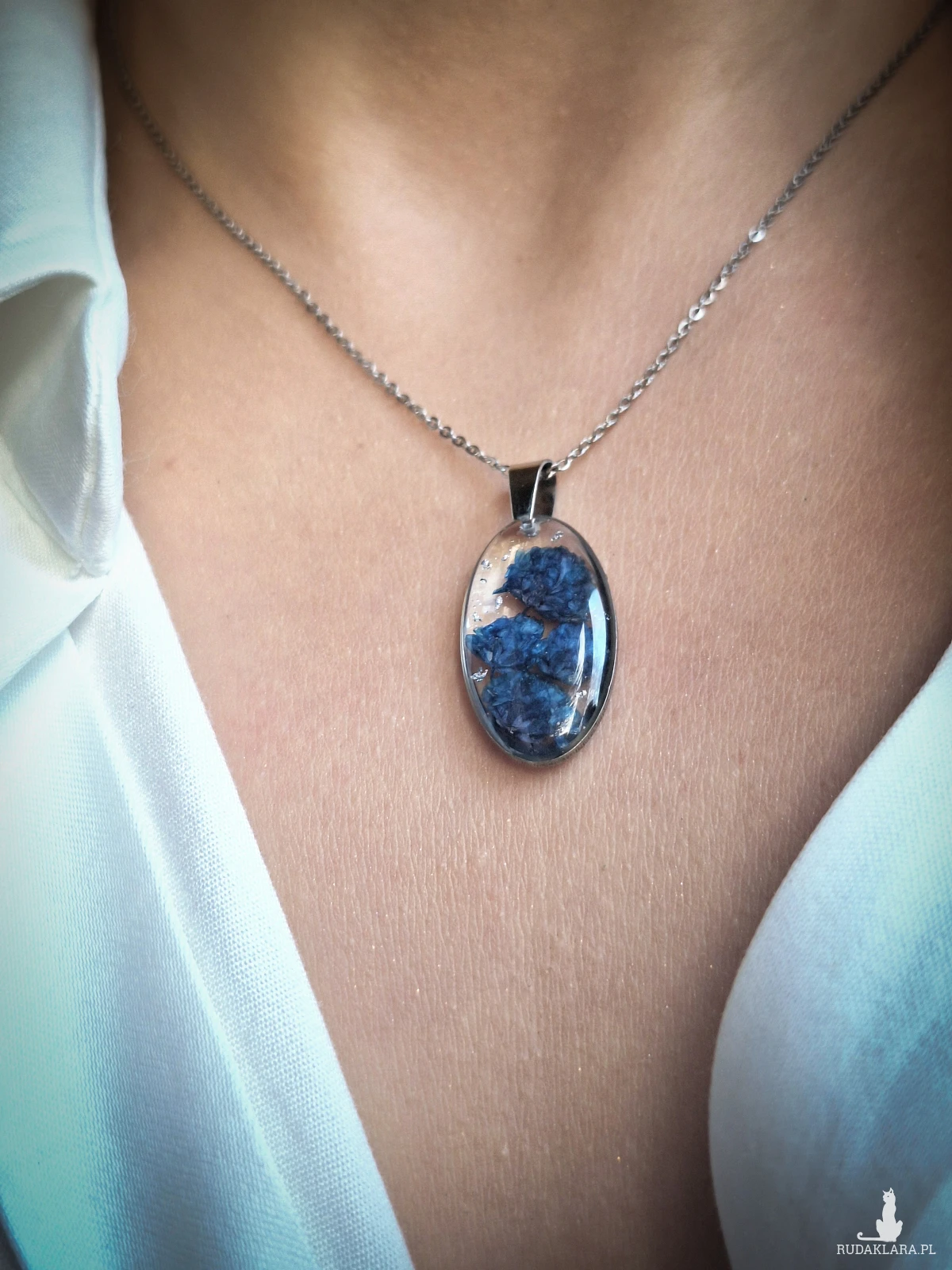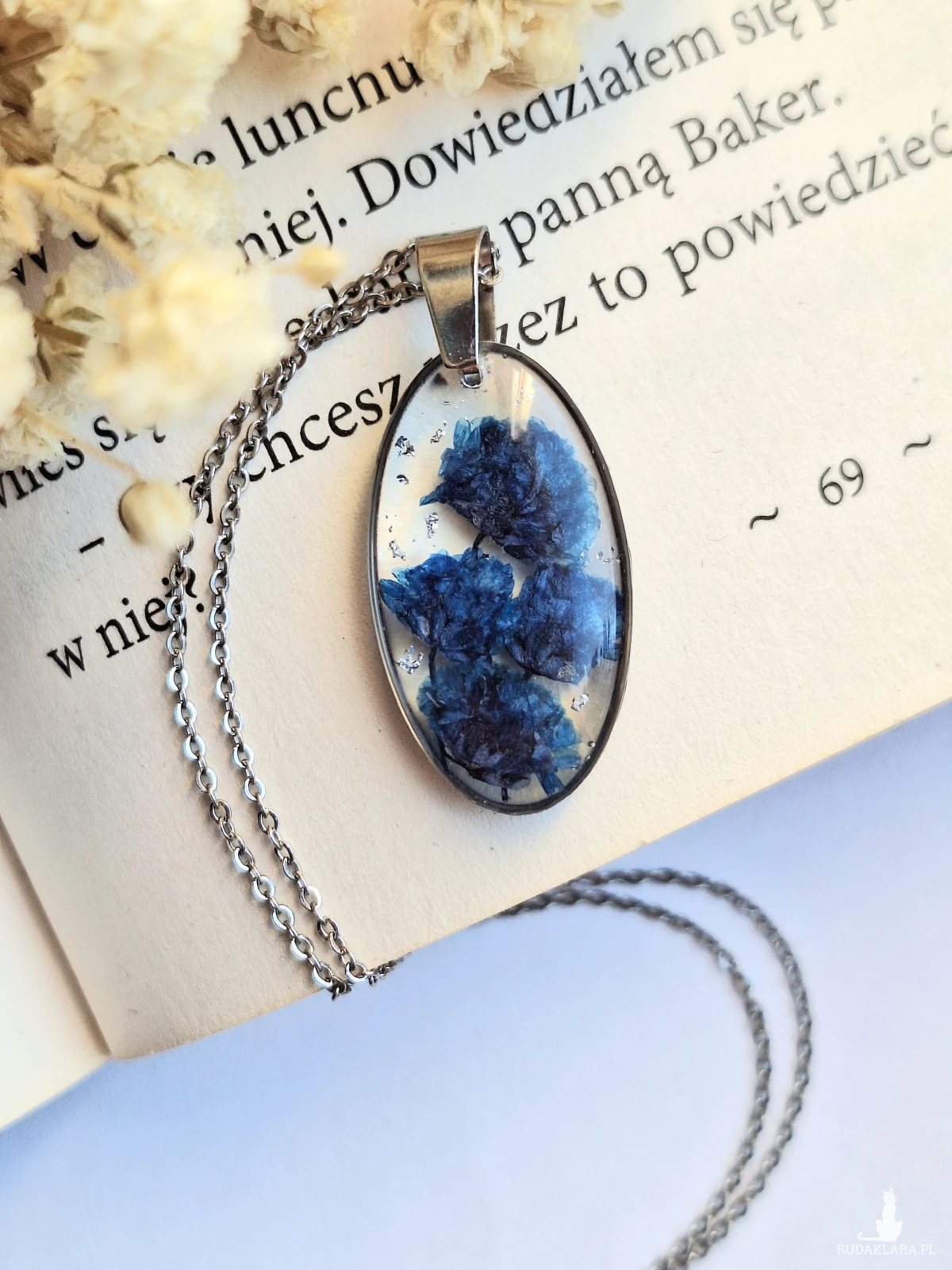 Uroczy wisiorek z zatopionymi kwiatami granatowej gipsówki i płatkami srebra. Wykonana z wysokiej klasy żywicy, która nie zmienia koloru pod wpływem promieniowania uv oraz wysokiej jakości stali chirurgicznej.