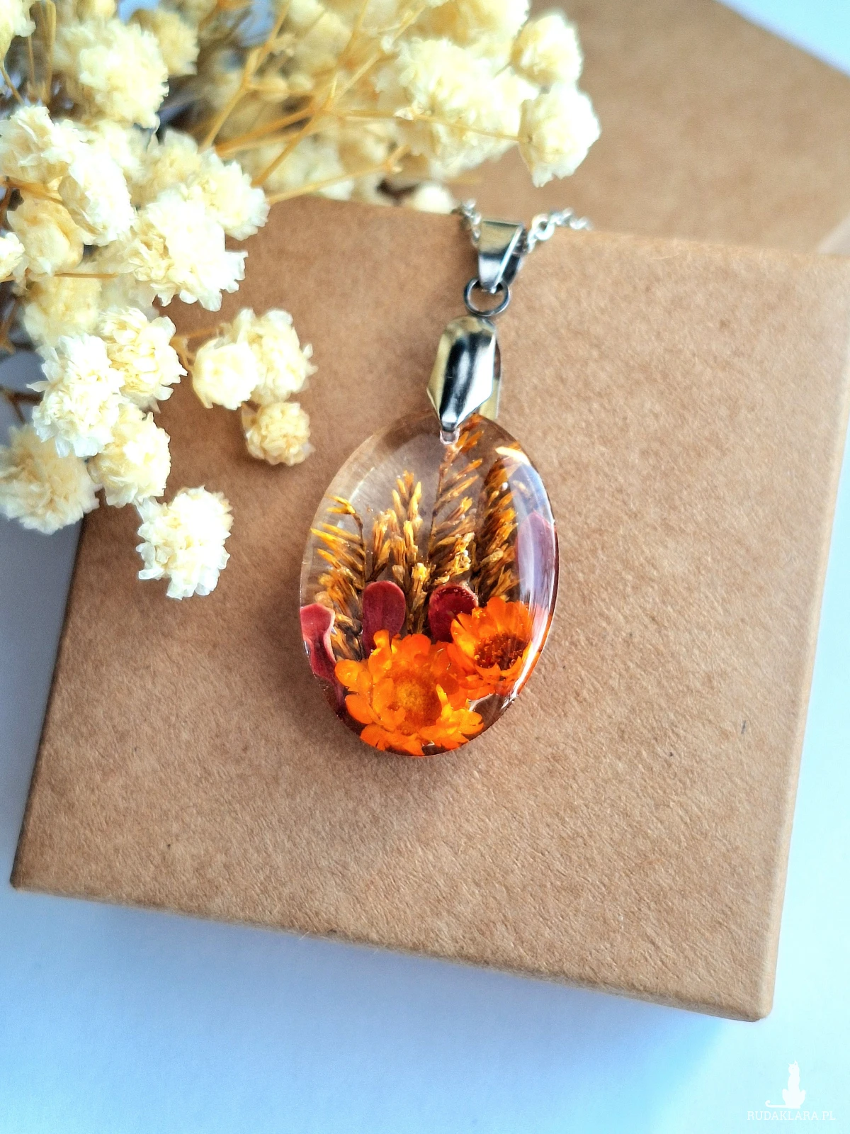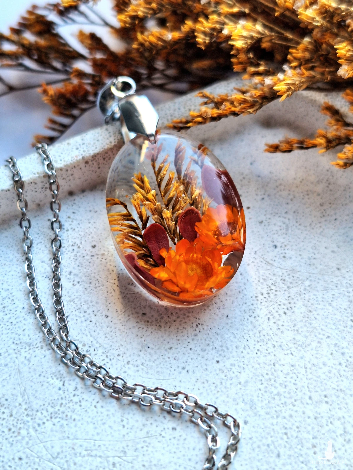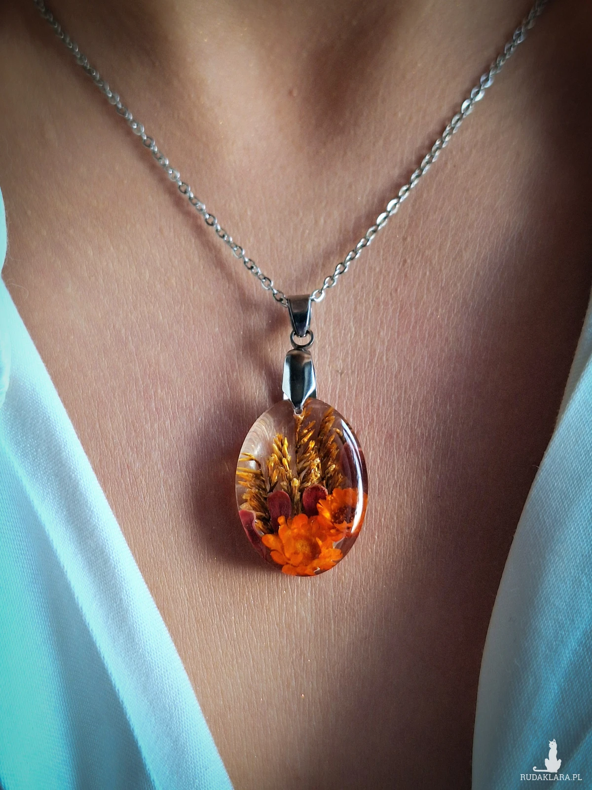 Uroczy wisiorek z zatopionymi kwiatami. Wykonany z wysokiej klasy żywicy, która nie zmienia koloru pod wpływem promieniowania uv oraz wysokiej jakości stali chirurgicznej.