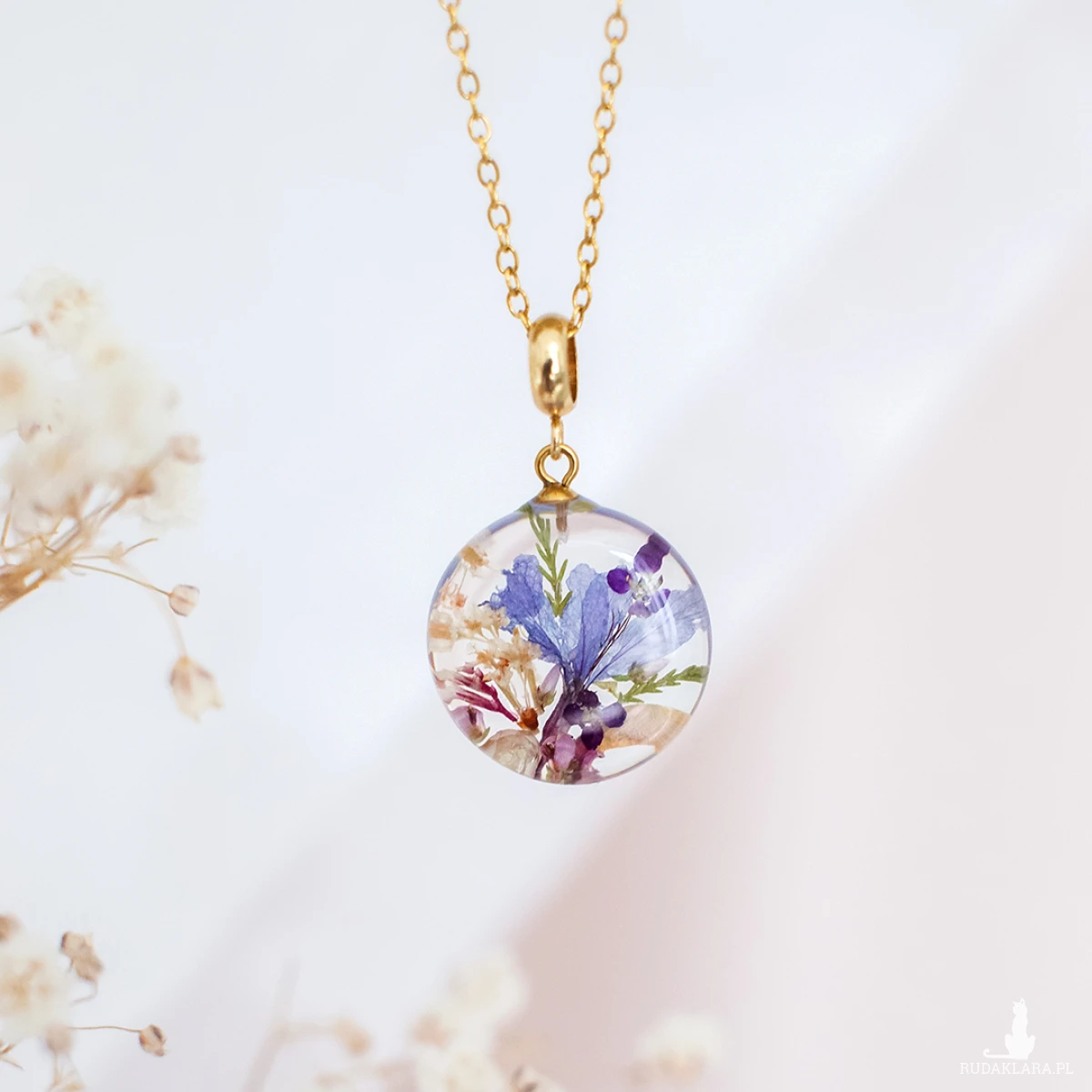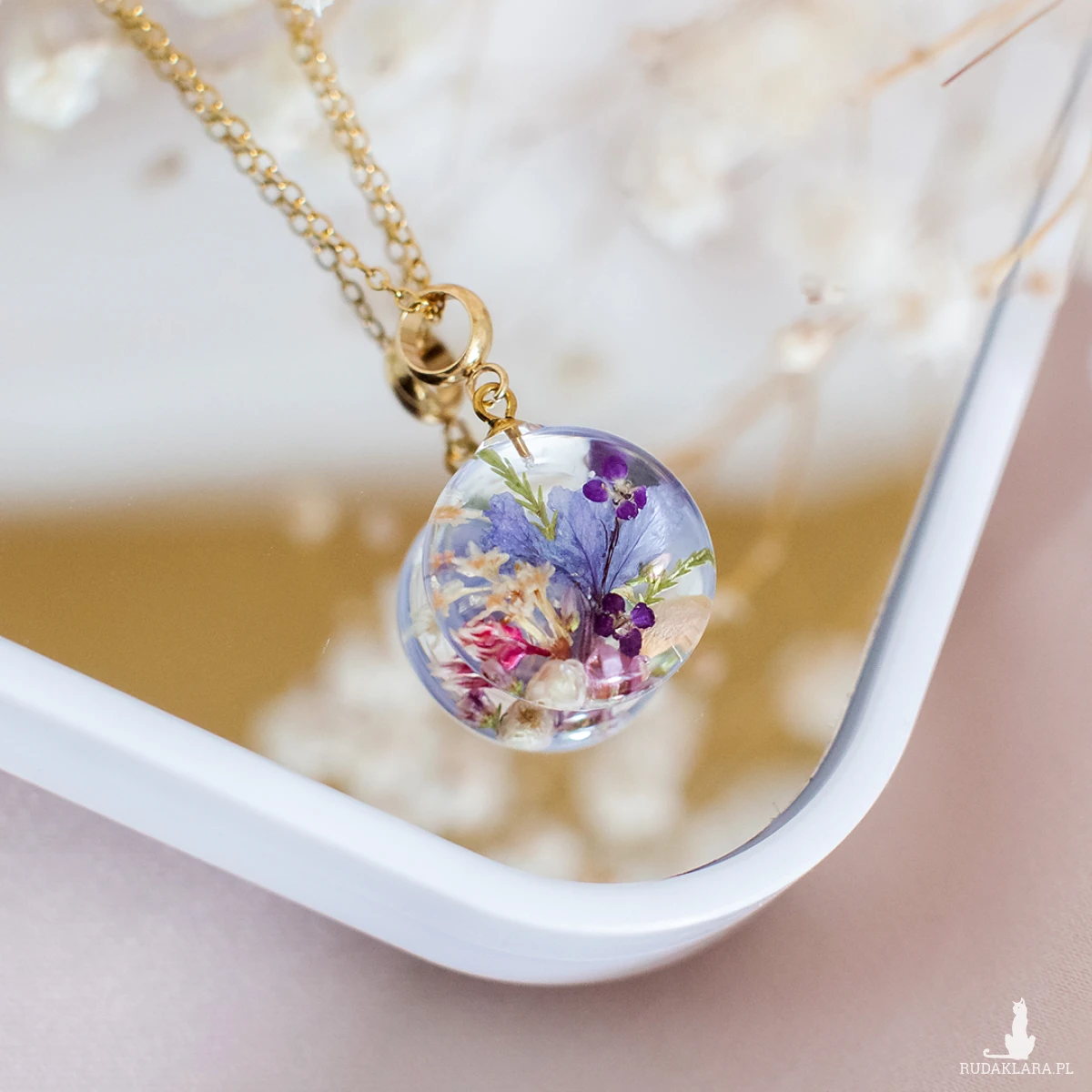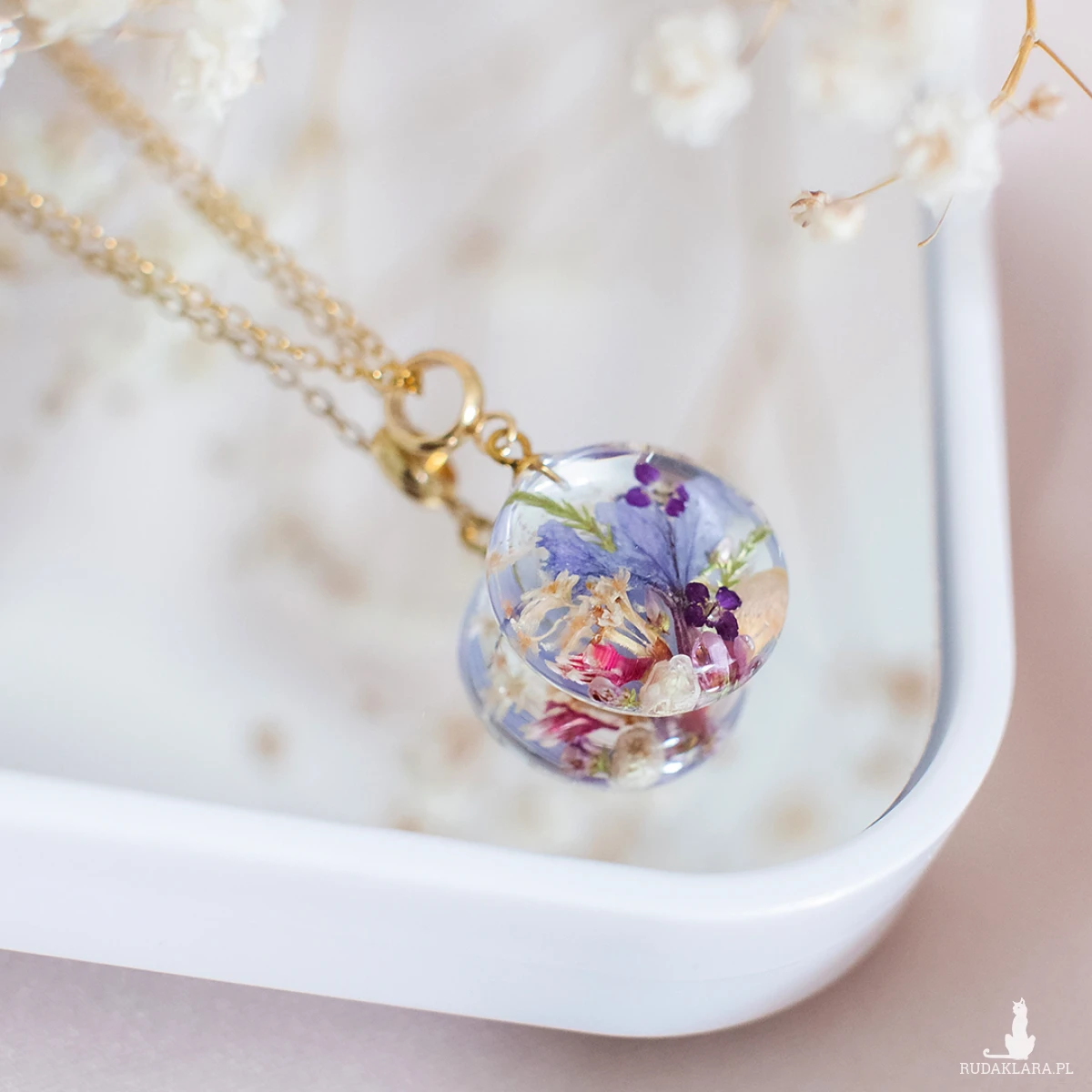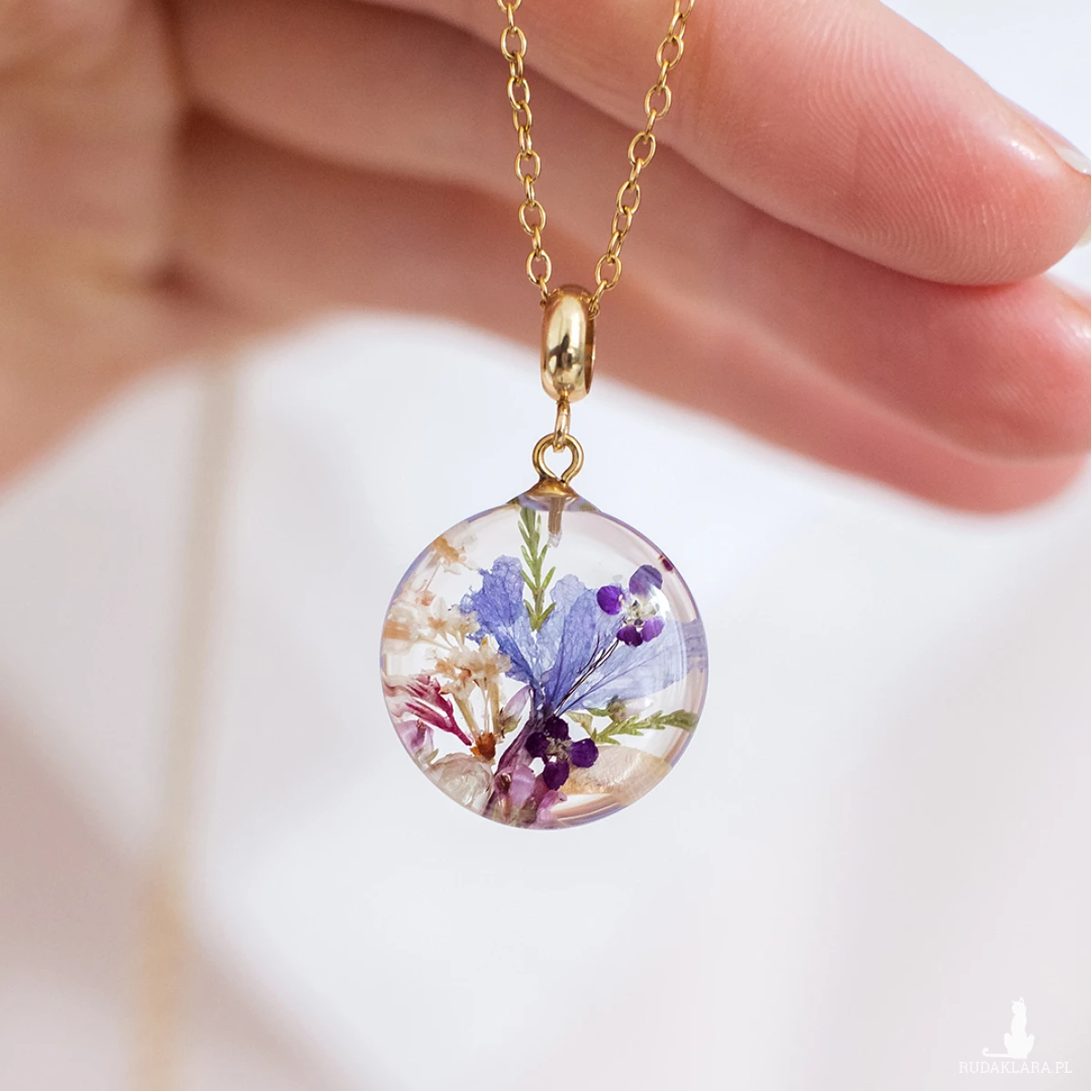 Wisiorek wykonany jest z żywicy epoksydowej z wykorzystaniem suszonych kwiatów. Metalowe elementy to stal nierdzewna szlachetna chirurgiczna.