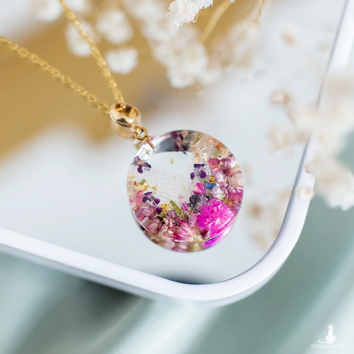 Wisiorek wykonany jest z żywicy epoksydowej z wykorzystaniem suszonych kwiatów. Metalowe elementy to stal nierdzewna szlachetna chirurgiczna.