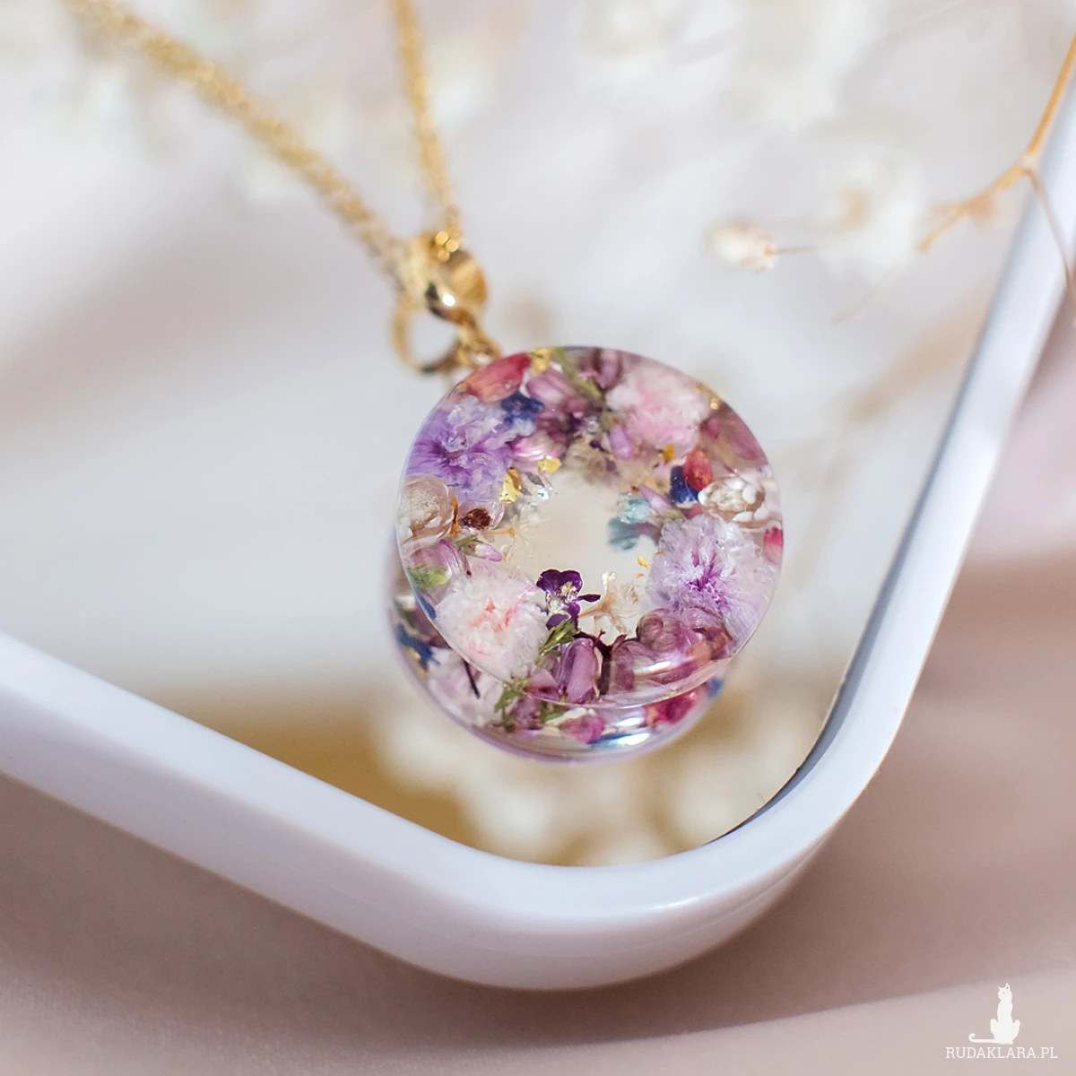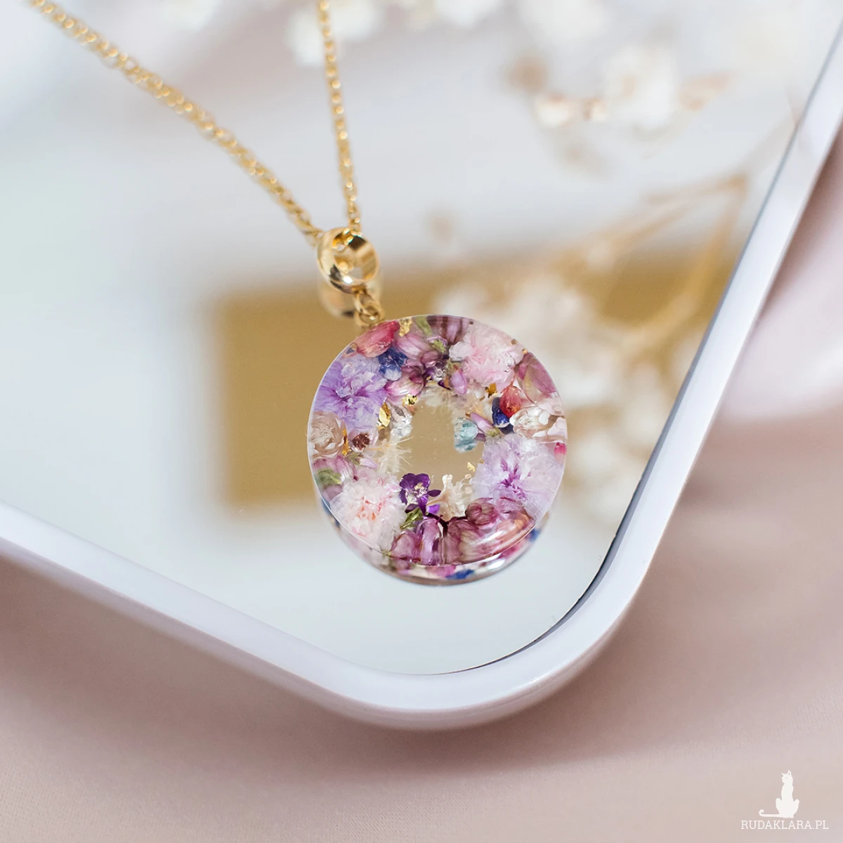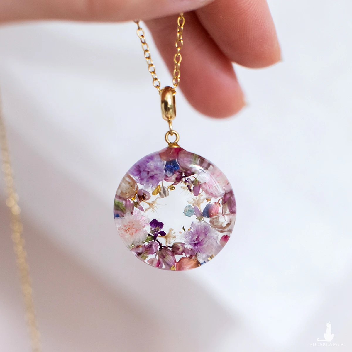 Wisiorek wykonany jest z żywicy epoksydowej z wykorzystaniem suszonych kwiatów. Metalowe elementy to stal nierdzewna szlachetna chirurgiczna.