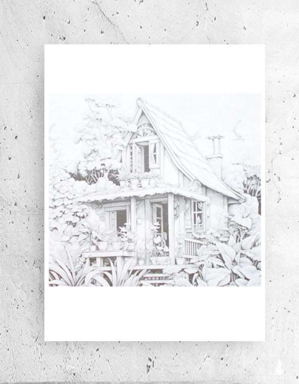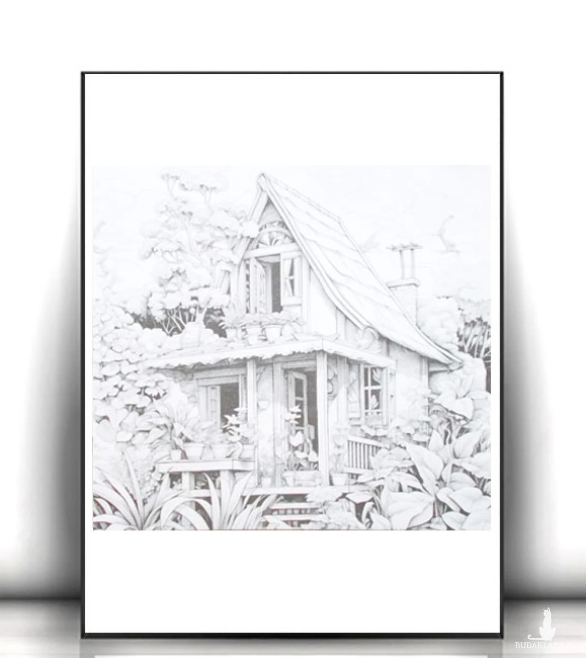Nowy plakat z chatką, domkiem. Biało czarna ilustracja na białym kartoniku A4. Poster wystarczy tylko umieścić w ramce 21x30 cm. Plakat na ścianę do sypialni, salonu, przedpokoju, jadalni, pokoju młodzieżowego lub dziecięcego, biura, gabinetu, holu, garderoby, kawiarni, restauracji itp. Grafika będzie pasowała do każdego wystroju wnętrz, zarówno do tych nowoczesnych, jak i bardziej tradycyjnych. Przedmiot do dekoracji domu lub mieszkania,