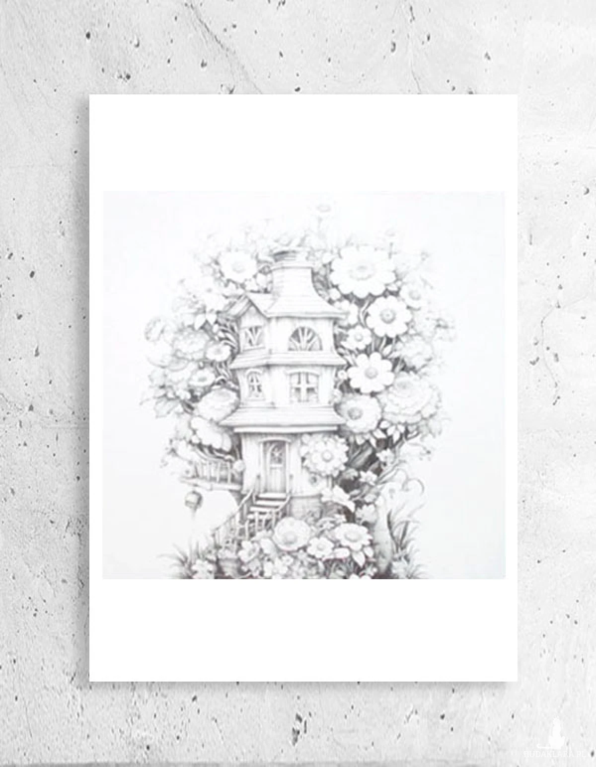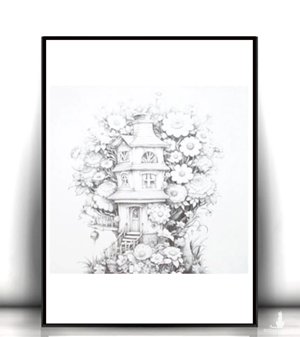 Nowy plakat z bajkową chatką, domkiem. Biało czarna ilustracja na białym kartoniku A4. Poster wystarczy tylko umieścić w ramce 21x30 cm. Plakat na ścianę do sypialni, salonu, przedpokoju, jadalni, pokoju młodzieżowego lub dziecięcego, biura, gabinetu, holu, garderoby, kawiarni, restauracji itp. Grafika będzie pasowała do każdego wystroju wnętrz, zarówno do tych nowoczesnych, jak i bardziej tradycyjnych. Przedmiot do dekoracji domu lub mieszkania,