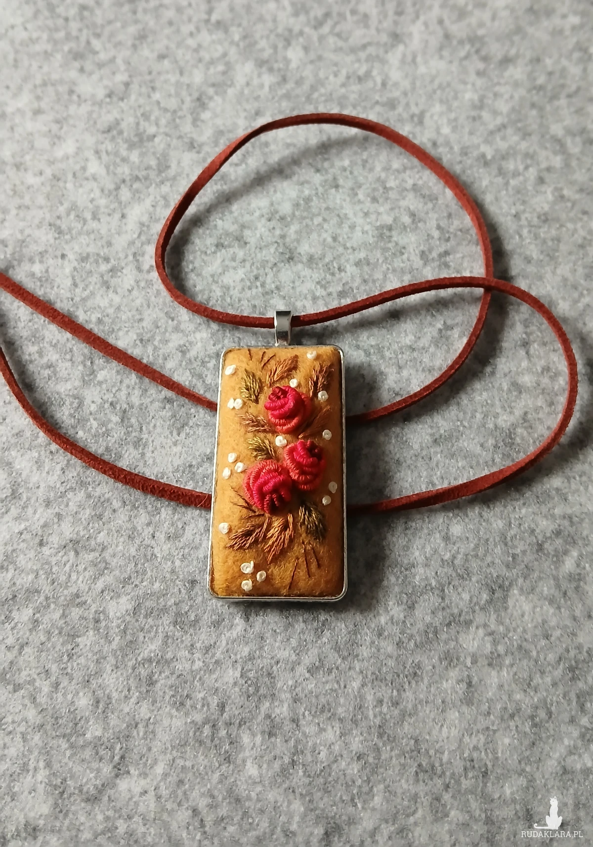 Jesienna ekspresja w stylowym, pełnym gracji bukiecie czerwonych róż na bursztynowym tle. Poczuj magię ręcznie haftowanej biżuterii i pozwól, by stała się dla Ciebie ważna.