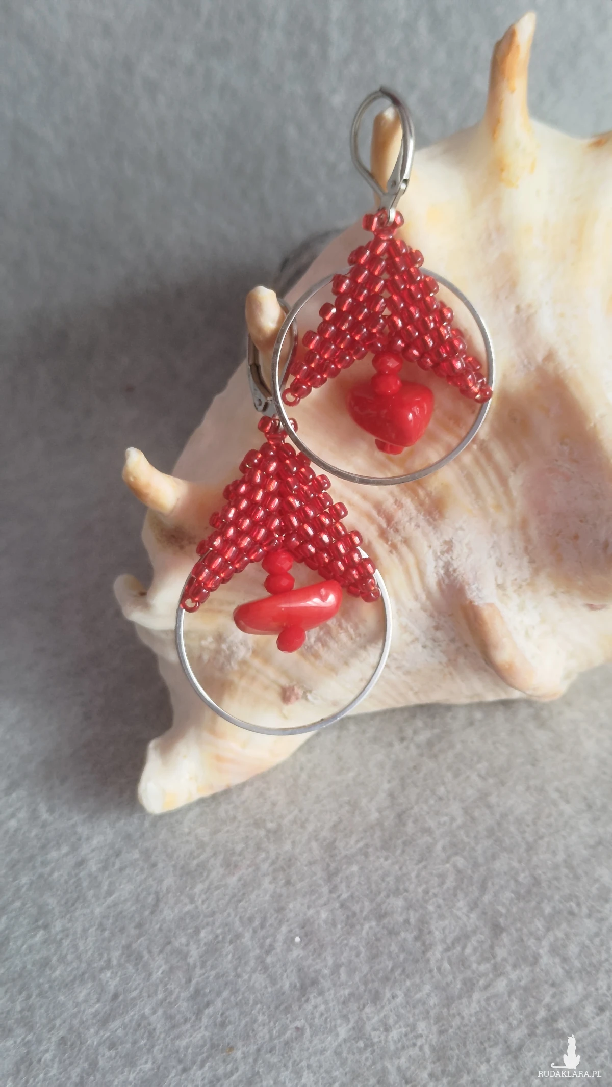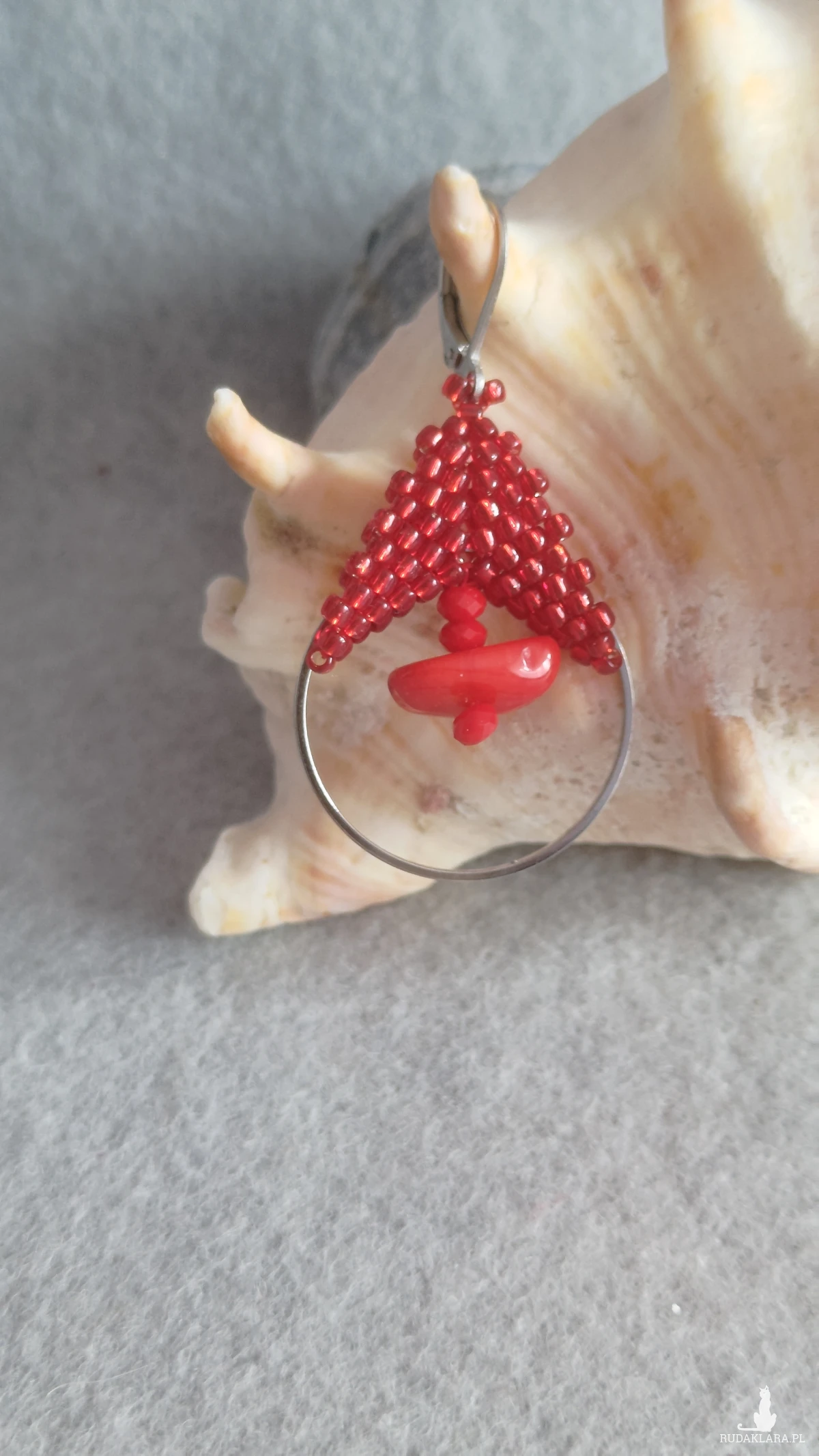 Kolczyki wykonane są z japońskich koralików toho techniką beadingu na okrągłej bazie o średnicy 3,5 cm. W środku kolczyka zaeieszony jest czerwony koral. Kolczyki zawieszone są na biglach angielskich ze stali chirurgicznej.