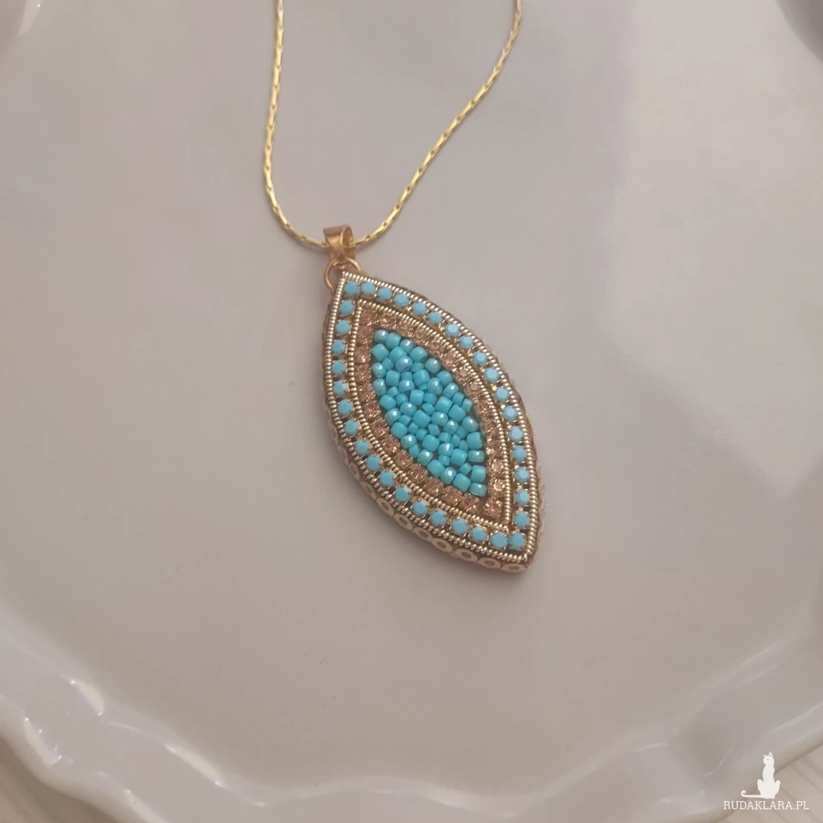 Niezwykle lekki, niepowtarzalny, kobiecy, wisior w kolorze turkusowym w złotym wykończeniu. Powstał techniką haftu koralikowego.