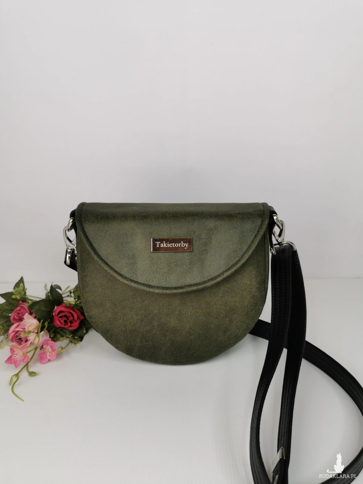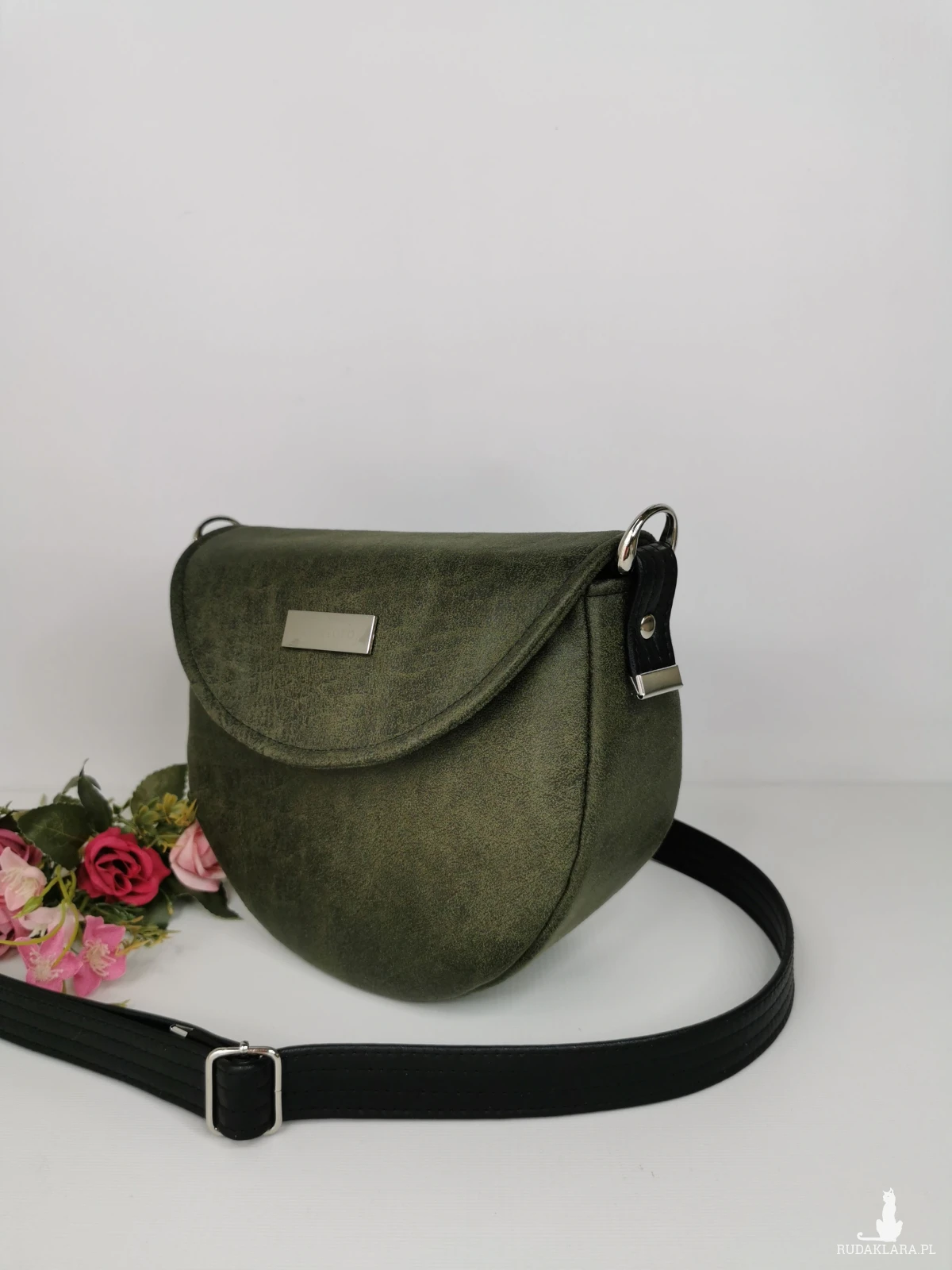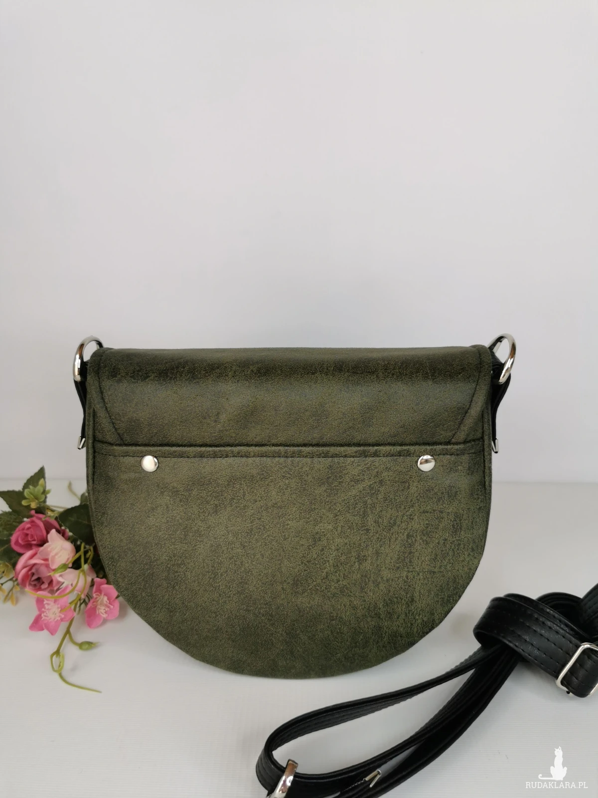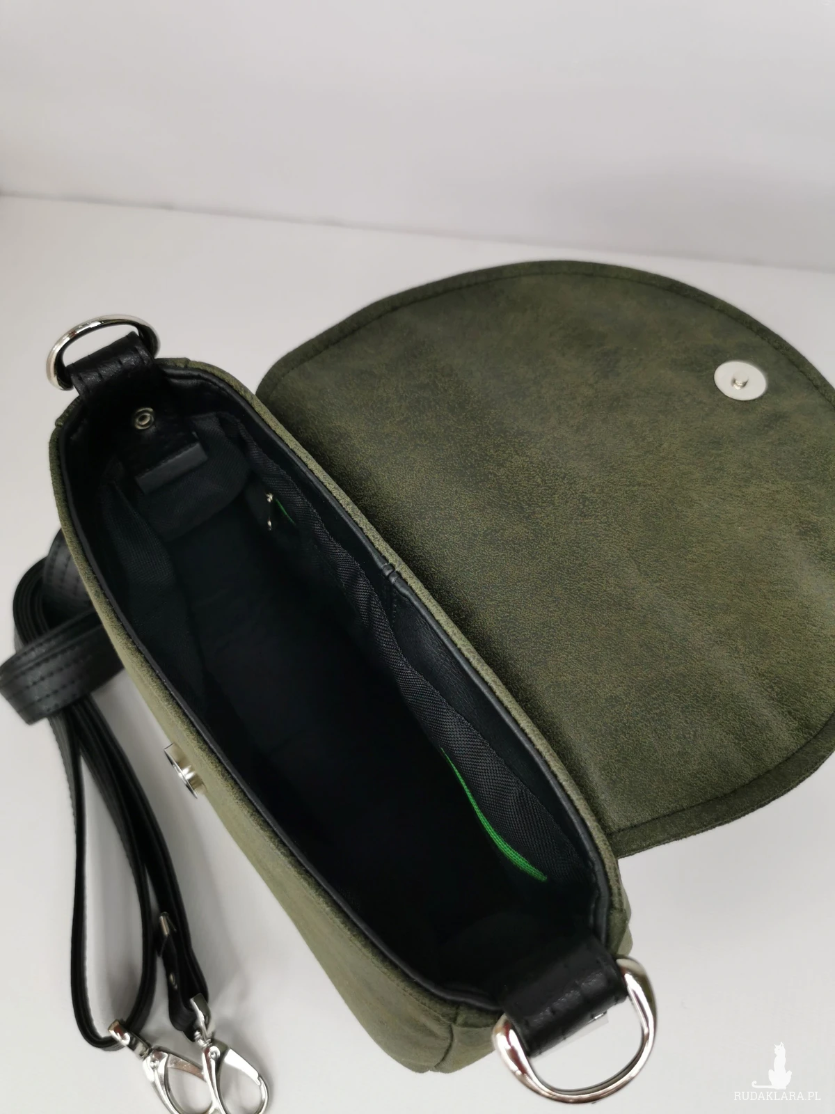 Torebka typu listonoszka z klapką . Została wykonana z tkaniny w kolorze zielonym khaki . W skład tkaniny wchodzi : 70% skóry naturalnej oraz 30 % poliestru . Torebka zapinana na zapięcie magnetyczne zamontowane w klapce . Podszewka z tkaniny poliestrowej wodoodpornej w kolorze czarnym . Wewnątrz znajduje się kieszeń zamykana na zamek . Torebka ma długi regulowany pasek z czarnej ekoskóry .