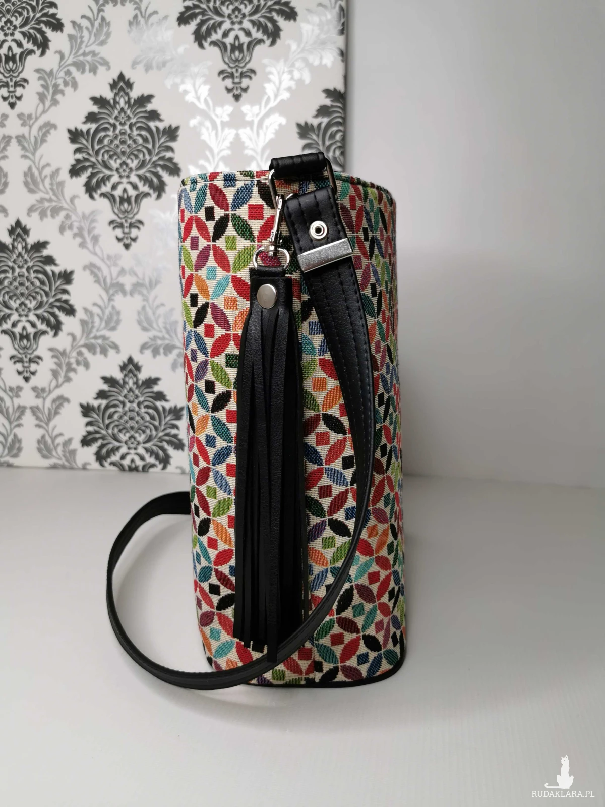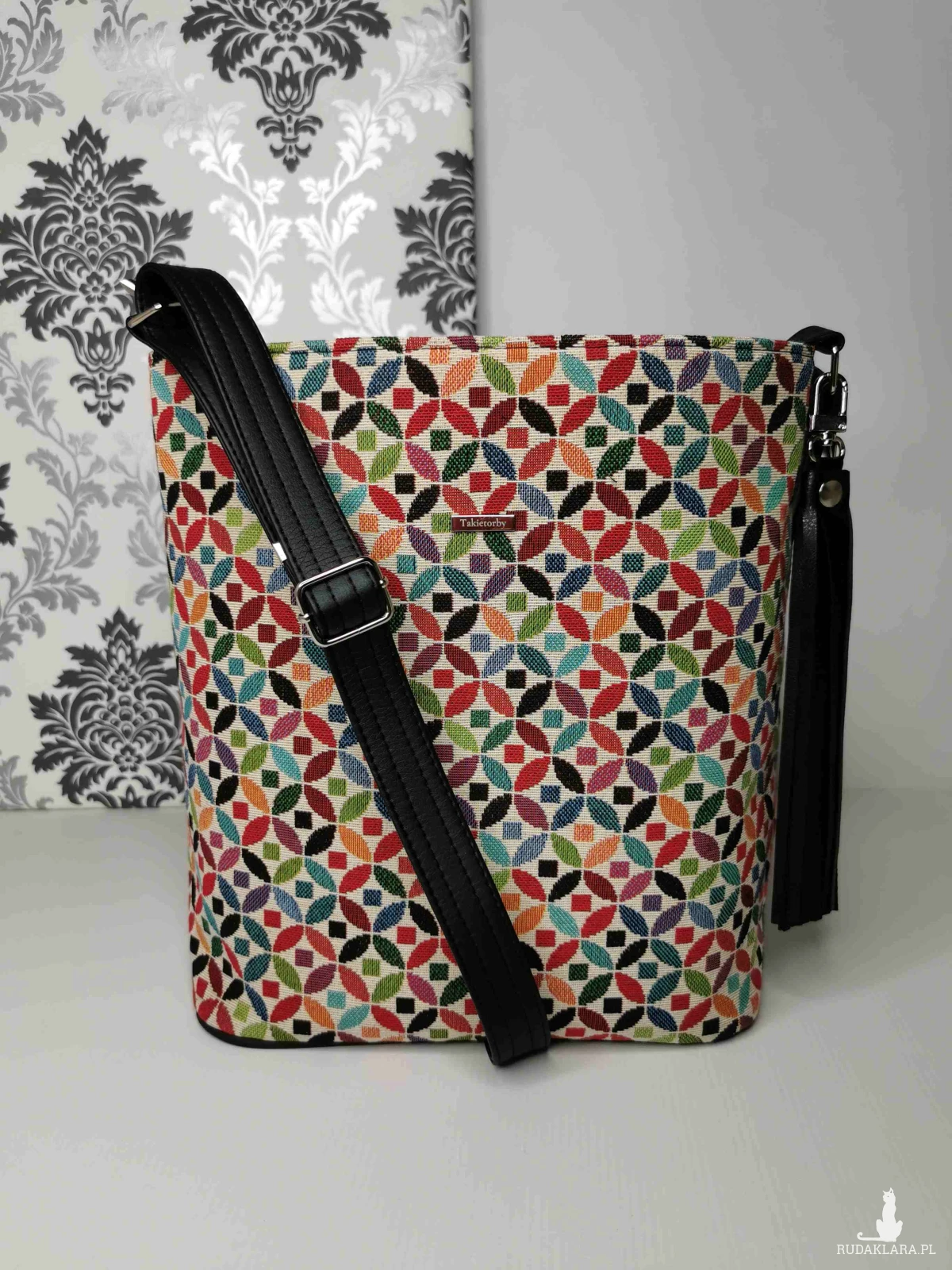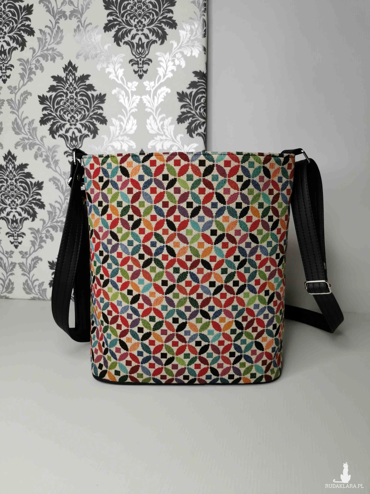 Torebka listonoszka na długim regulowanym pasku z zaokrąglonym dnem .  W komplecie , ozdobny odpinany chwost  . Torebka została wykonana z tkaniny żakardowej w kolorowy geometryczny wzór i ekoskóry w kolorze czarnym .  Zapinana na zamek .  Wewnątrz , podszewka z tkaniny poliestrowej wodoodpornej w kolorze czarnym  , oraz dwie pojemne kieszenie w tym jedna zapinana na zamek . Zamontowana jest też smycz z karabińczykiem na klucze .