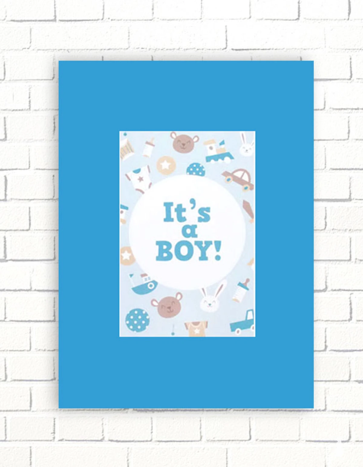 Nowy plakat z napisem "It's a boy" (To chłopiec). Obrazek jest na ciemnoniebieskim kartoniku A4. Dekoracja na ścianę do pokoju małego chłopczyka, żłobka, przedszkola, bawialni, klubu malucha itp. Plakat wystarczy dać do ramki 21x30 cm.. Poster będzie pasował zwłaszcza do wnętrz urządzonych w stylu skandynawskim, nowoczesnym, hygge, minimalistycznym, loftowym, mieszanym.