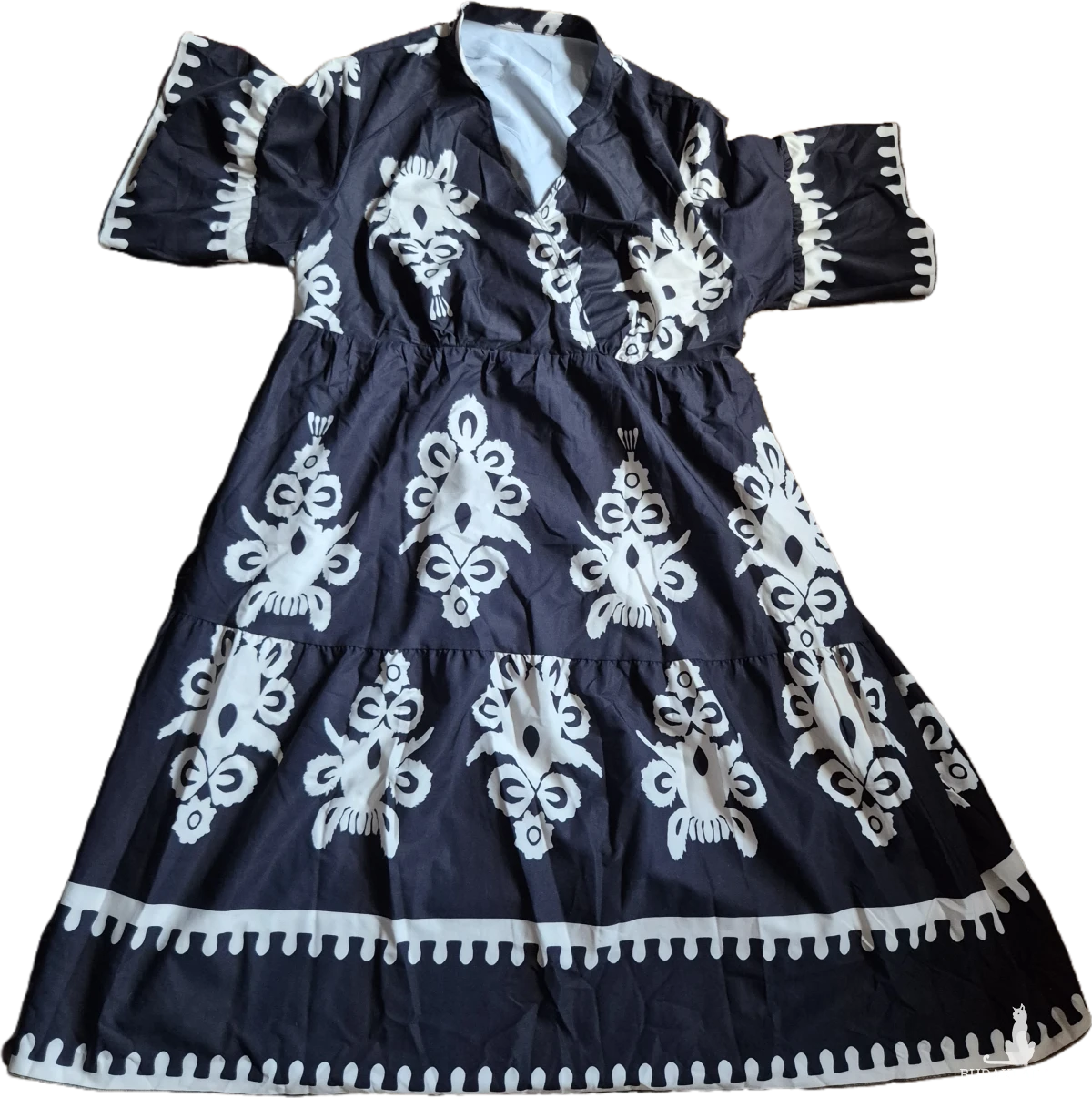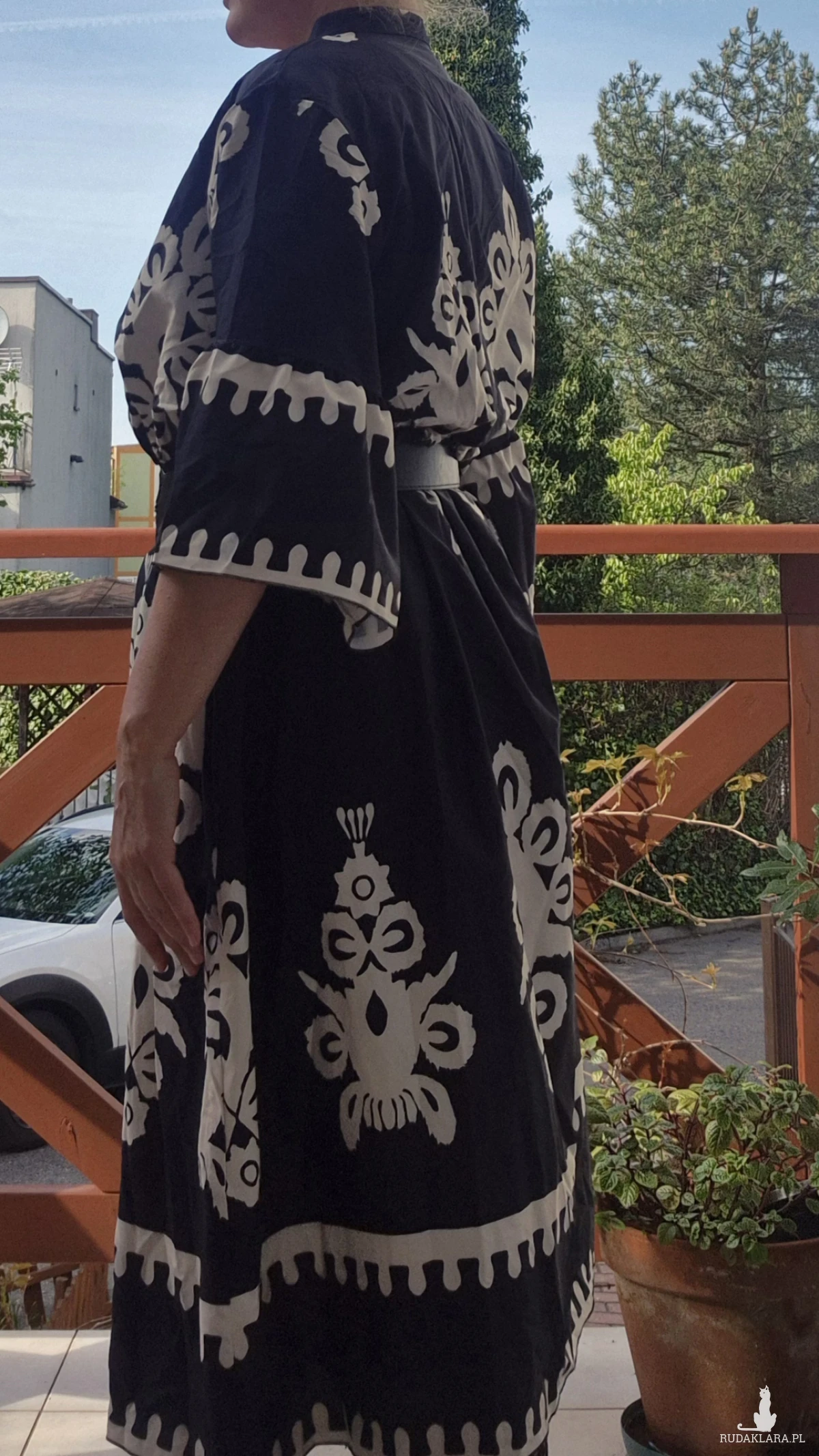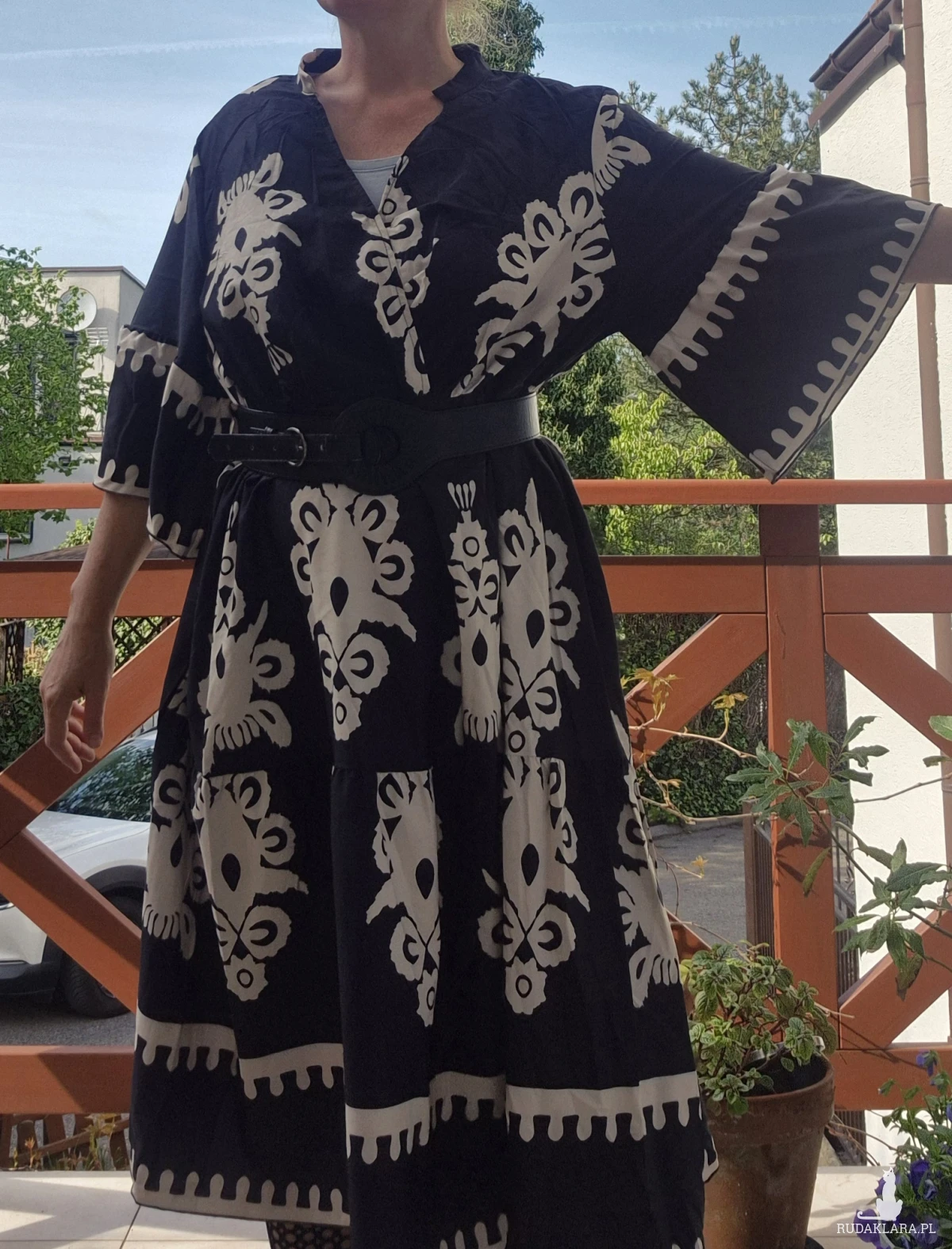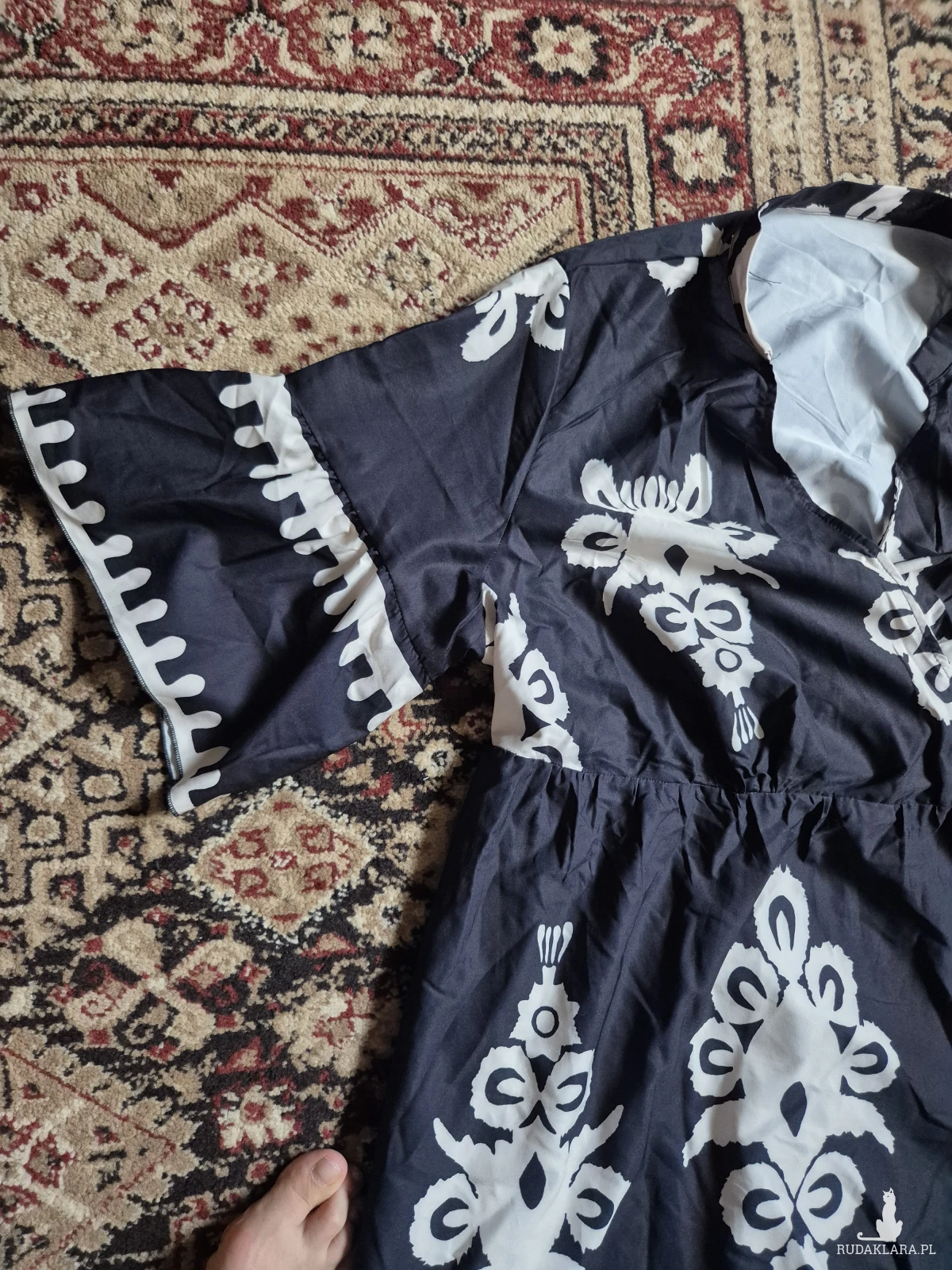 Sukienka kimonowa czarno-biała rozmiar 2XL osoba na zdjęciu ma 158 cm wzrostu i rozmiar 38, dla mnie ta sukienka to jest oversize która dobrze wygląda nawet na małej osobie