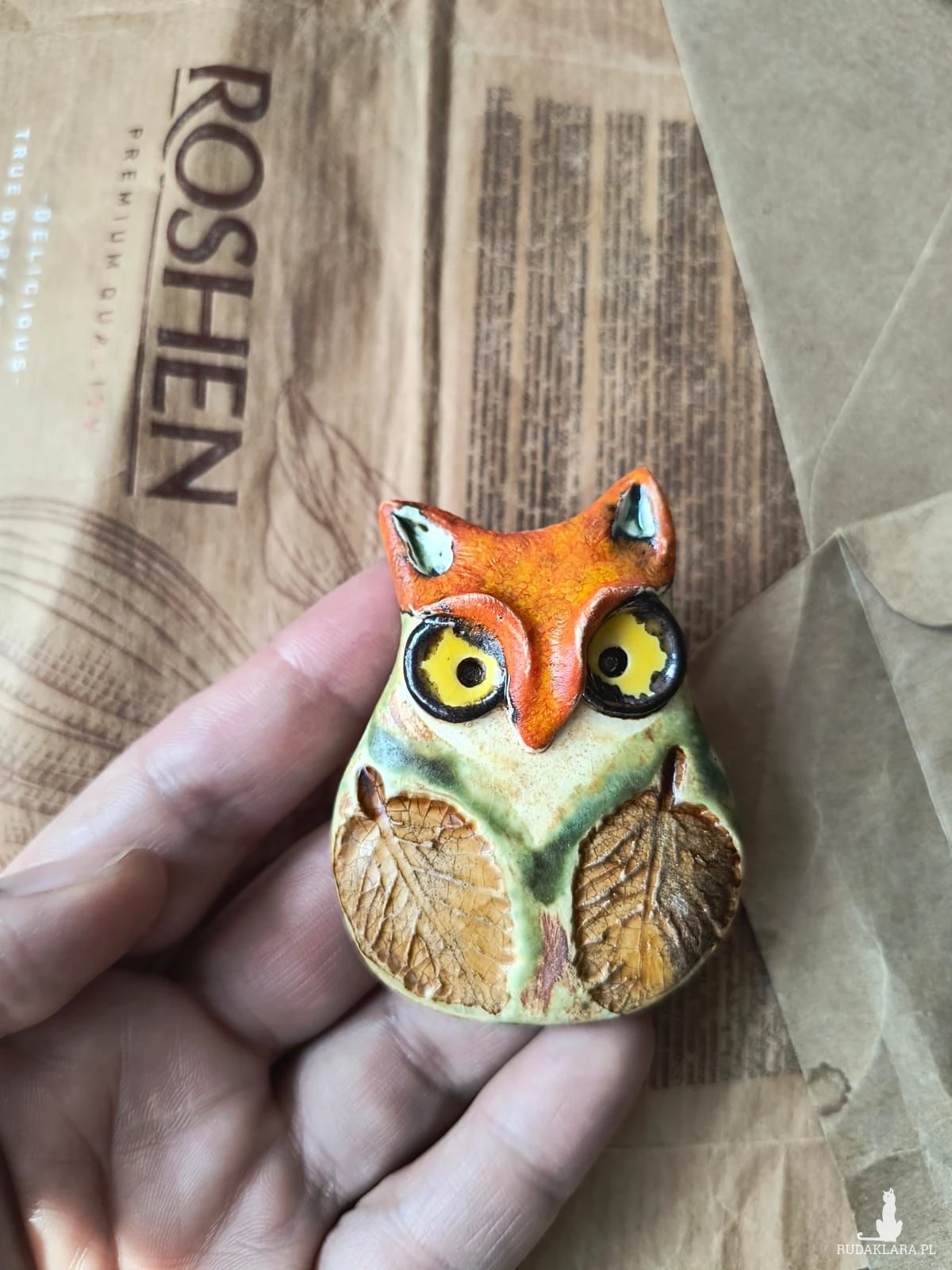 Broszka ceramiczna sówka wykonana z gliny szamotowej, wypalona na biskwit, a następnie szkliwiona w temp. ok 1260 stopni C. Wymiary ok 5,5 cm x 5 cm. Polecam wszystkim miłośniczkom nietuzinkowej biżuterii.