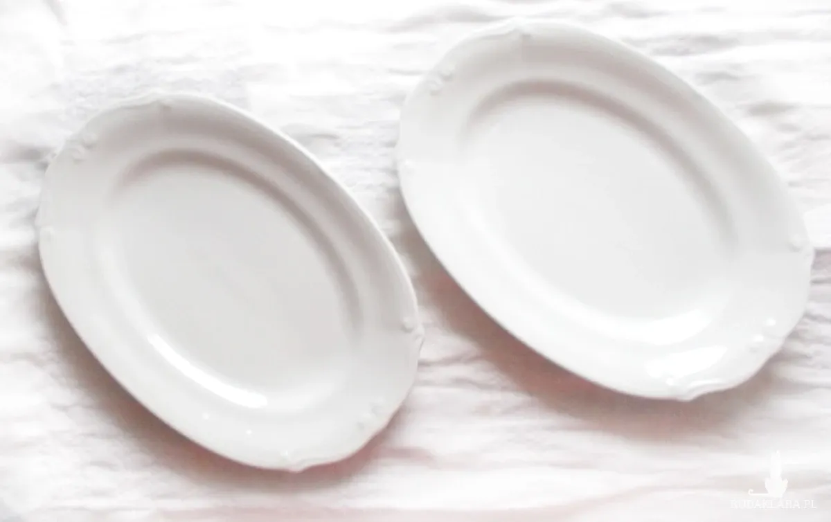 Oryginalny przedmiot vintage, duży półmisek z czasów PRL, XX w. Producent: "Chodzież", porcelana. Jeden półmisek ma widoczną sygnaturę, drugi startą lub niedobitą. Wymiary: 32,8 cm x 22,8 cm x 3 cm. Posiada ryski użytkowe. Ogólny stan bdb. CENA ZA 1 SZTUKĘ. Dostępne są 2 egzemplarze. Naczynie będzie pasowało do wnętrz urządzonych w stylu rustykalnym, prowansalskim, tradycyjnym, boho, mieszanym, retro, klasycznym.