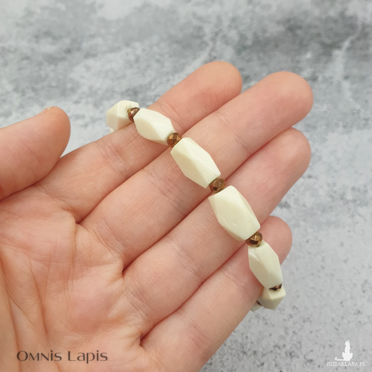 Główną ozdobę bransoletki stanowią przekładki z naturalnej kości bawolej, przedzielone drobnymi oponkami hematytu.