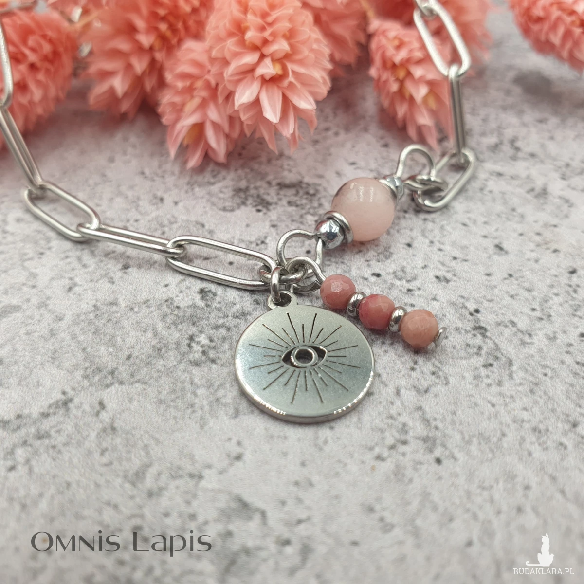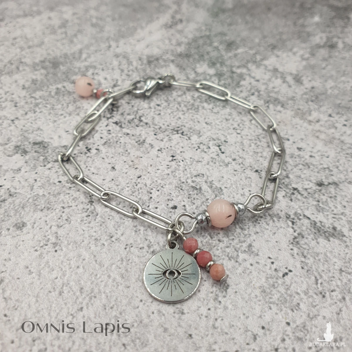 Oryginalna bransoletka z grubym, masywnym łańcuchem. Wykonana ze stali szlachetnej, ozdobiona opalowym jadeitem, hematytem oraz drobnymi kulkami rodochrozytu. Dodatkową ozdobę bransoletki stanowi stalowa zawieszka z motywem oka.