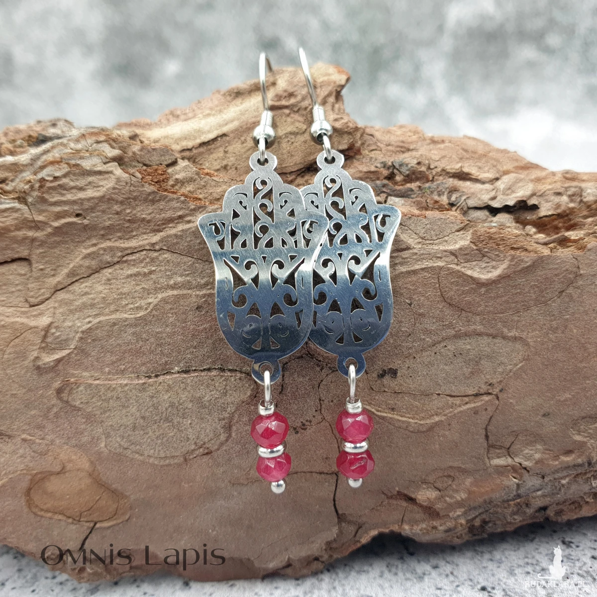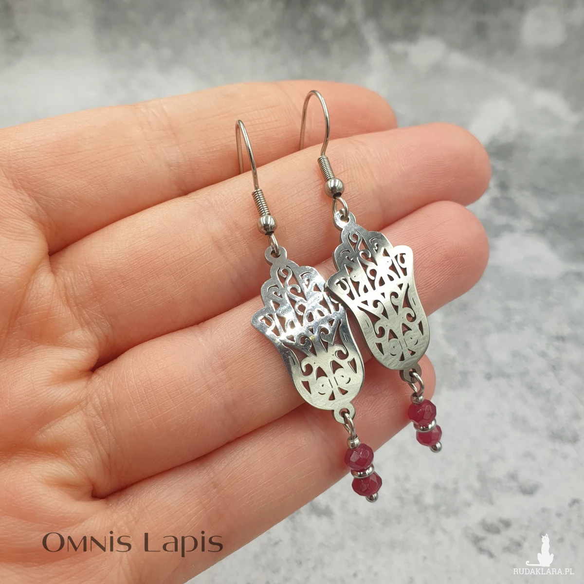 Wiszące, okazałe kolczyki etniczne z motywem ręki Hamsy/Fatmy. Ozdobione drobnymi, fasetowanymi oponkami jadeitu w kolorze bordo. Wykonane ze stali szlachetnej.